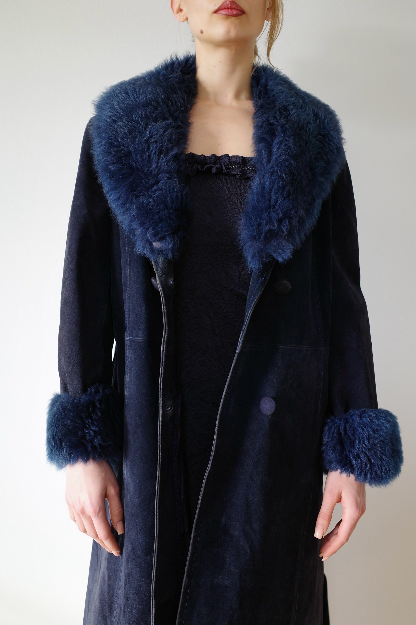 Elegant vintage Yves Saint Laurent coat from the 1980s, crafted from deep navy suede with a dramatic fur collar and cuff details. The coat features a removable fur lining, making it versatile for different seasons. Finished with a double-breasted button closure and a luxurious silk inner lining with YSL logo. A timeless archival piece, approximately 40–50 years old, combining classic tailoring with bold vintage character.
