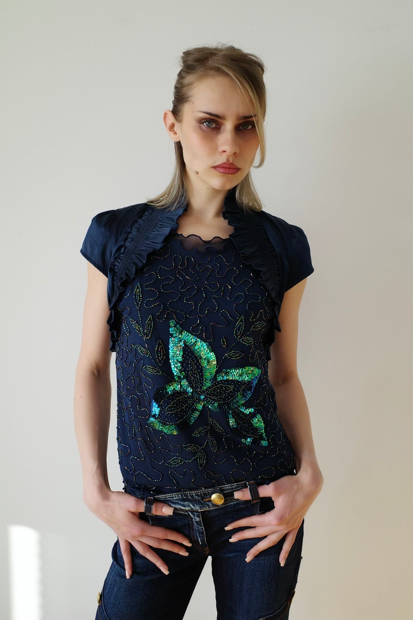 Vintage 1990s statement tanktop featuring intricate sequin embroidery on a sheer mesh base. The front is decorated with vibrant floral sequin detailing and colorful beaded embroidery. A bold Y2K-era piece perfect for layering or evening styling.