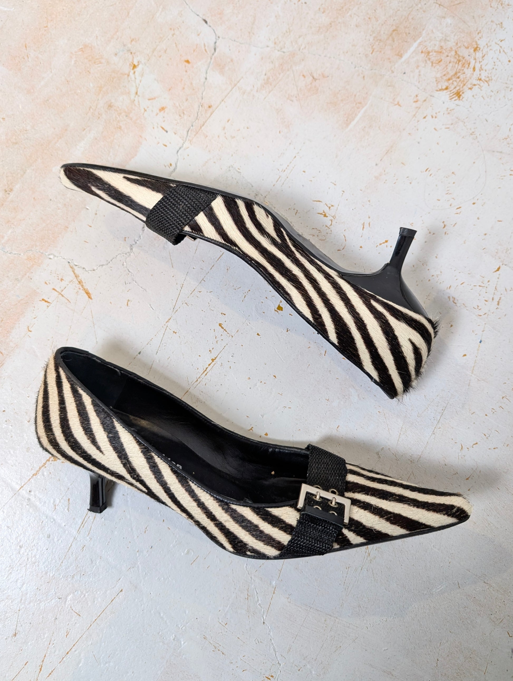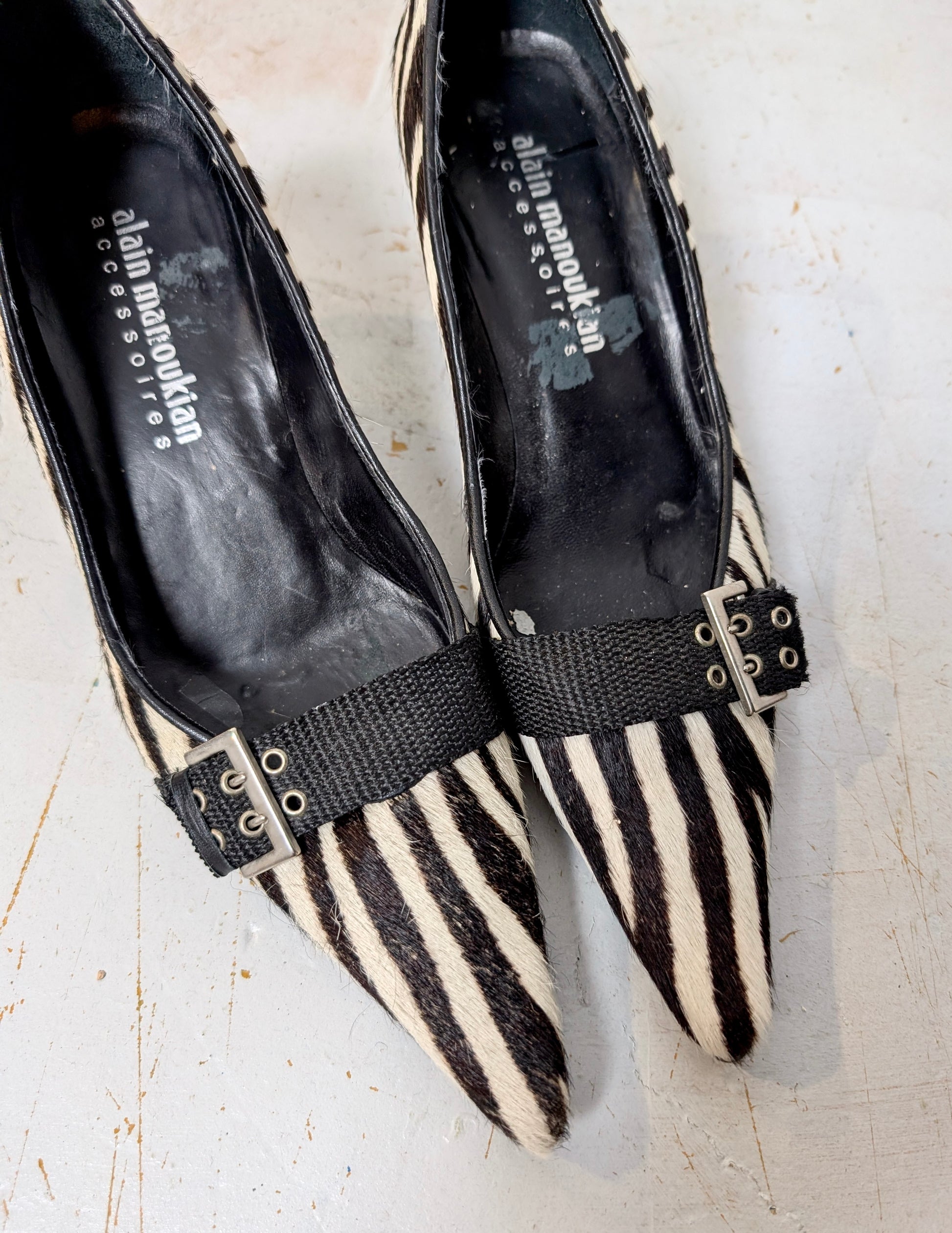 ALAIN MANOUKIAN - These iconic zebra mules are the definition of statement footwear. Featuring a bold zebra-print fur upper, sleek buckle details, and a chic kitten heel, they balance vintage charm and edge. The pointed toe adds a touch of sophistication. Very Carrie, obviously.