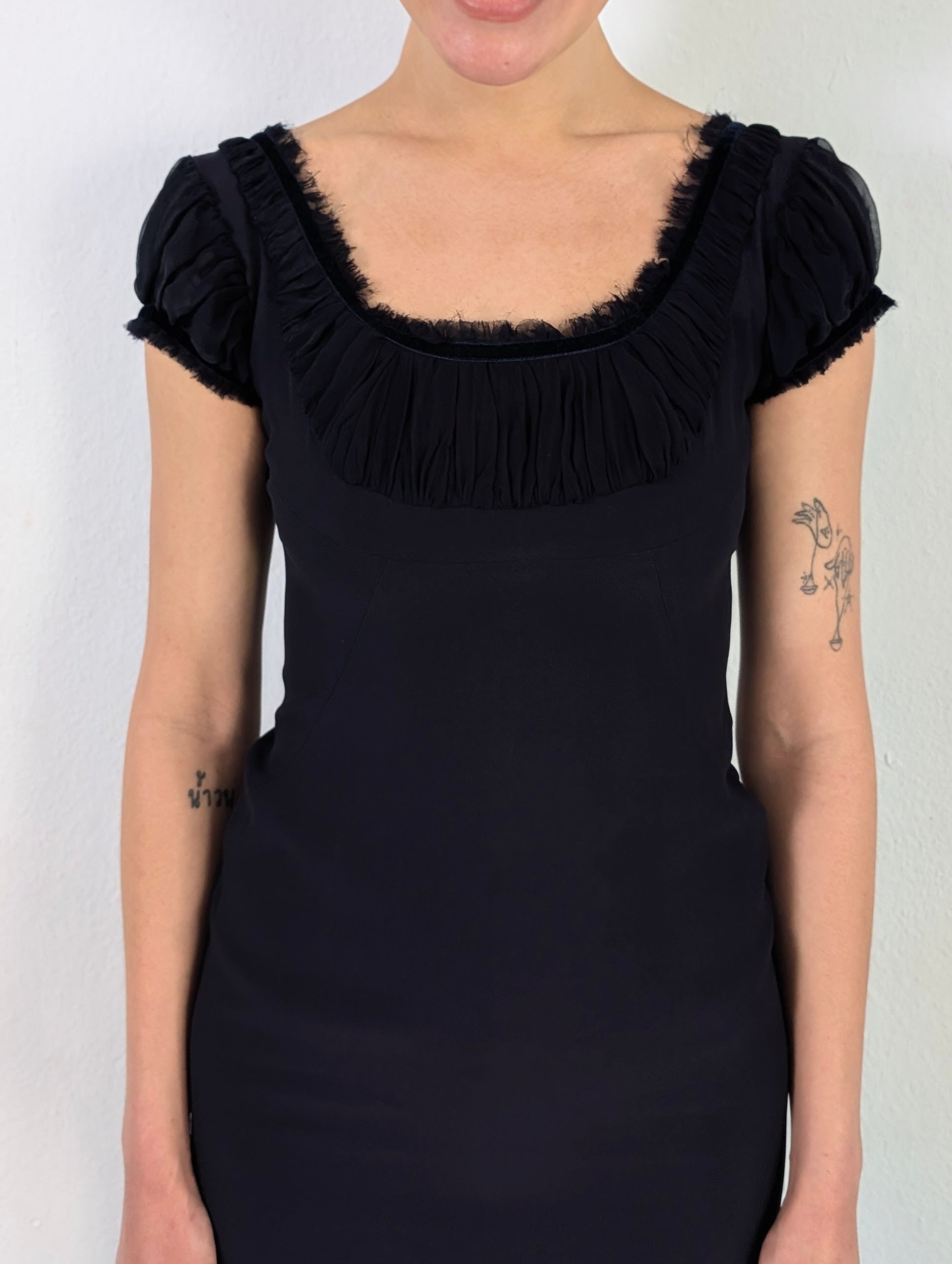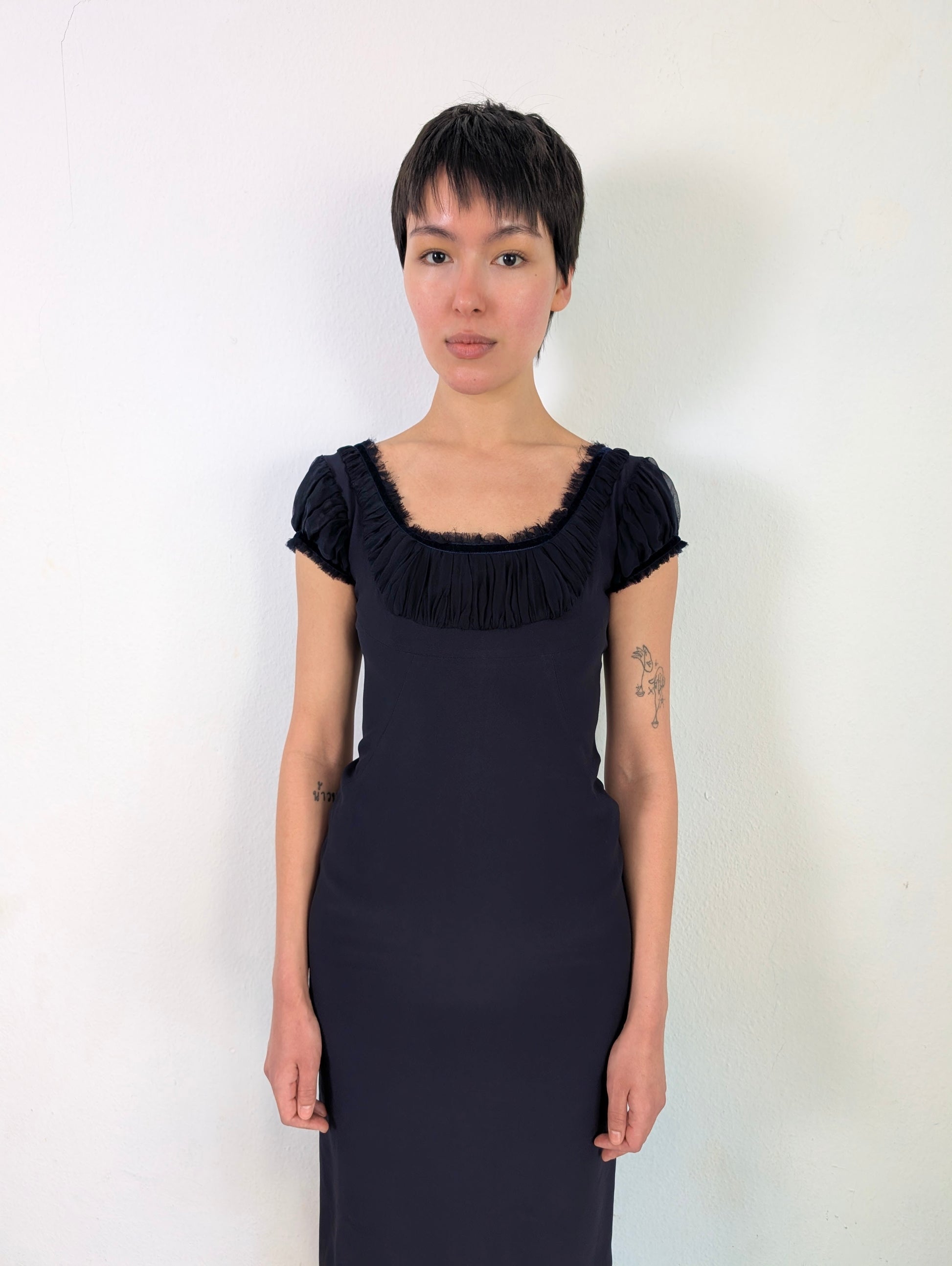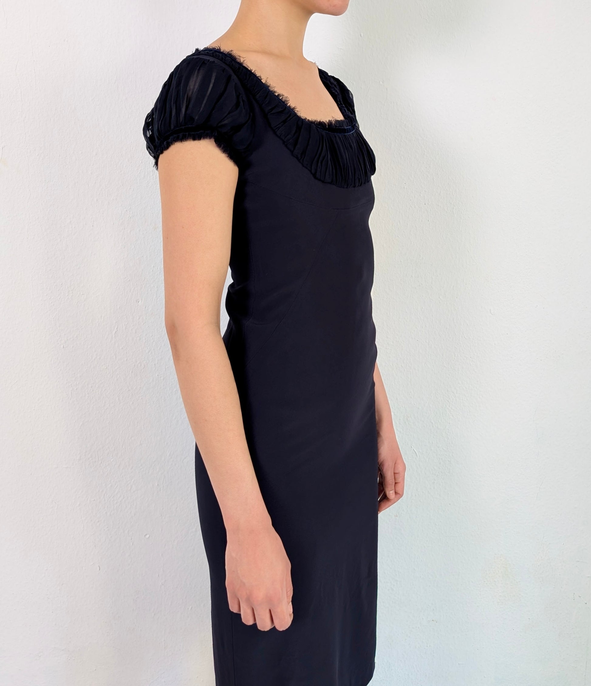This dress features a vintage-inspired design with a fitted, structured cami-style bodice in a dark navy blue, layered over a black chiffon underlay.