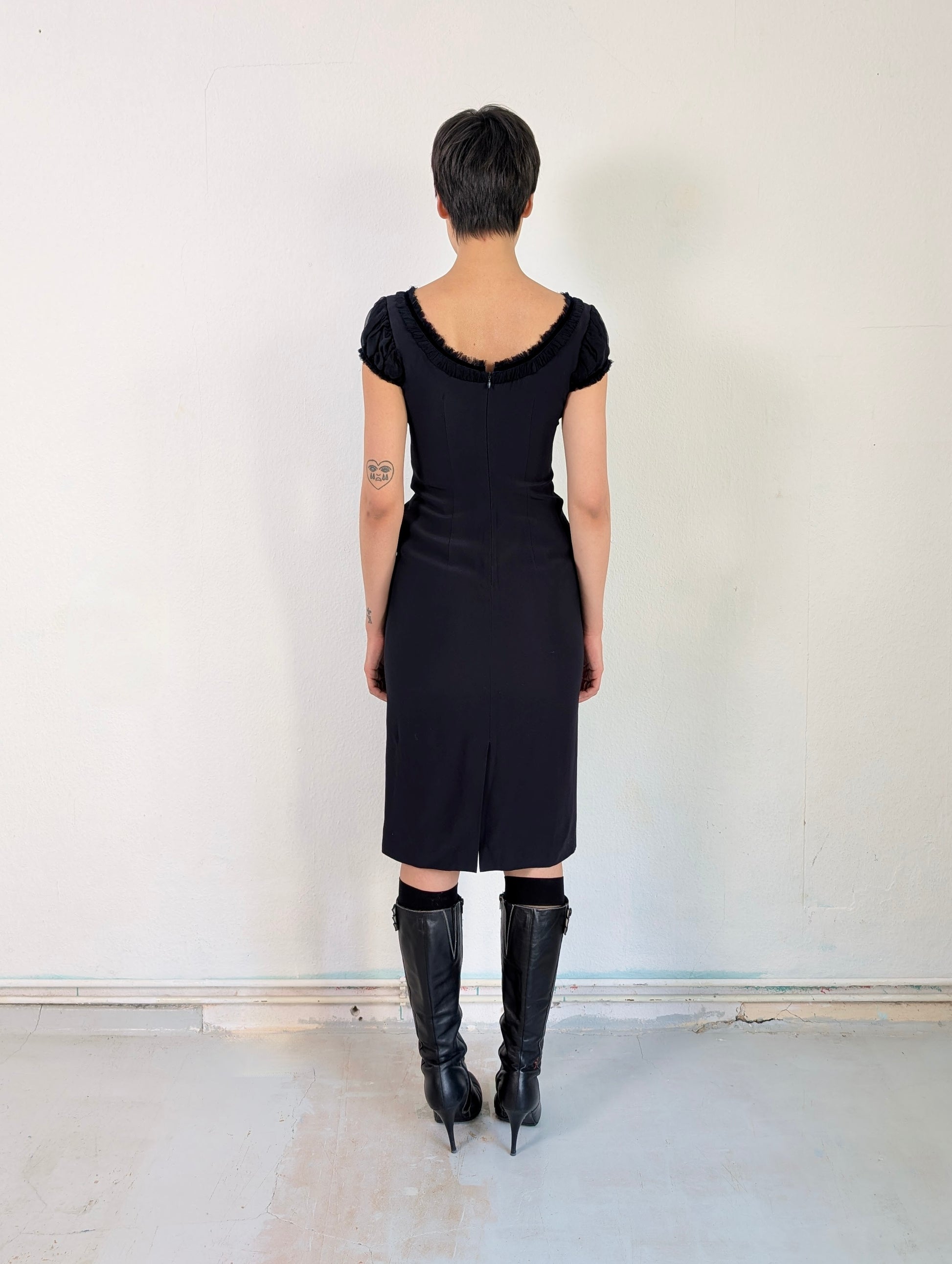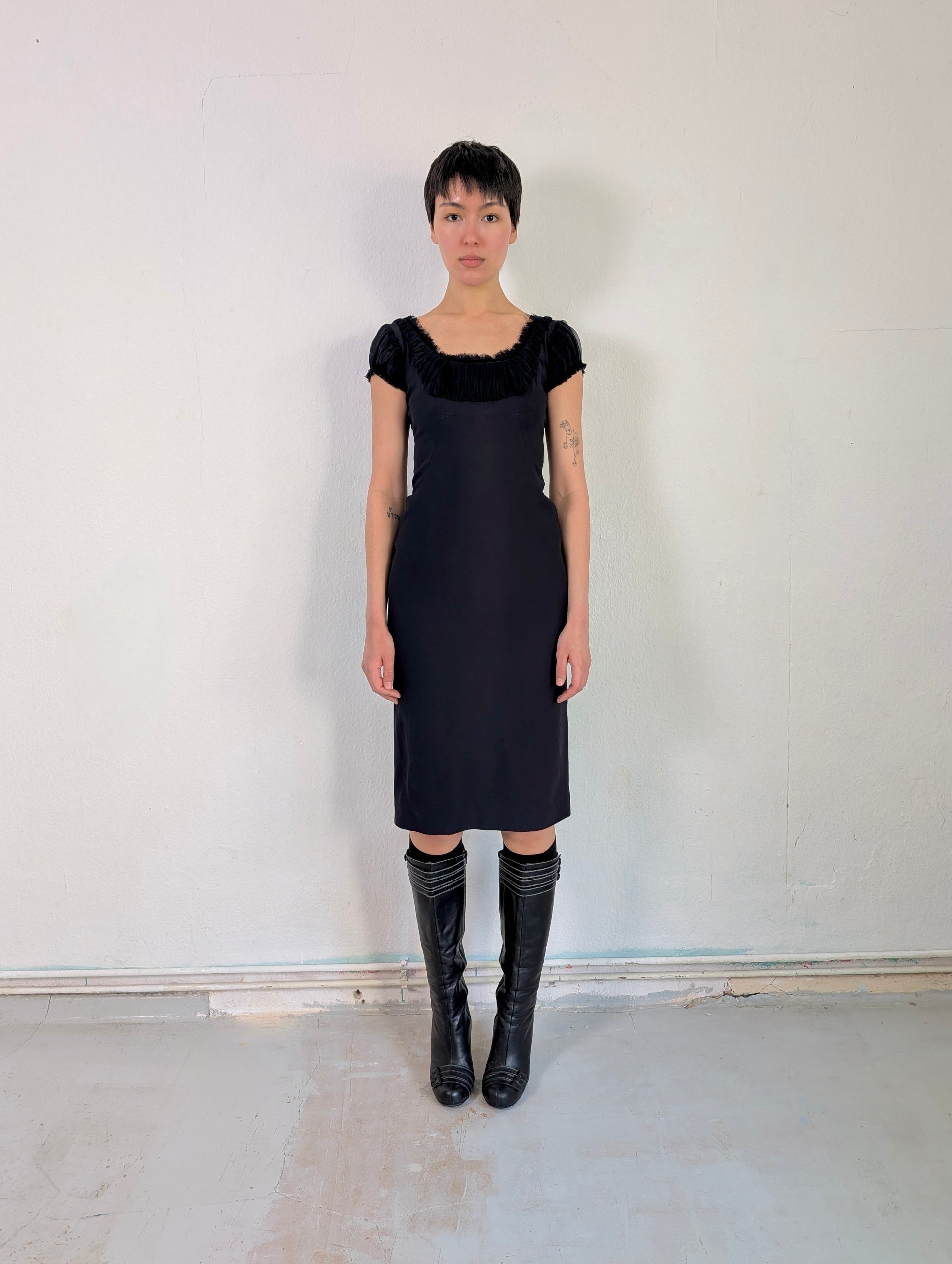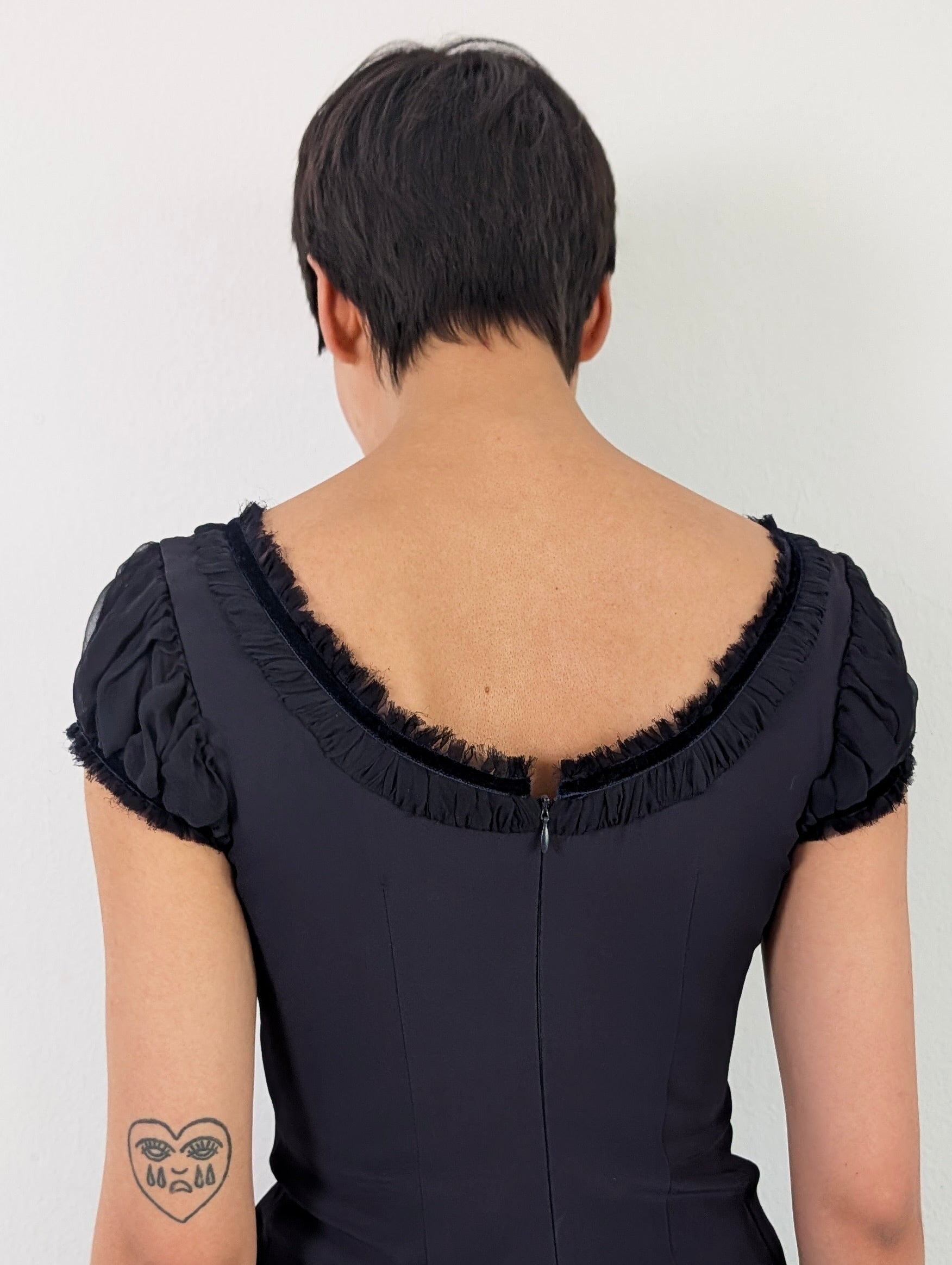 This dress features a vintage-inspired design with a fitted, structured cami-style bodice in a dark navy blue, layered over a black chiffon underlay.