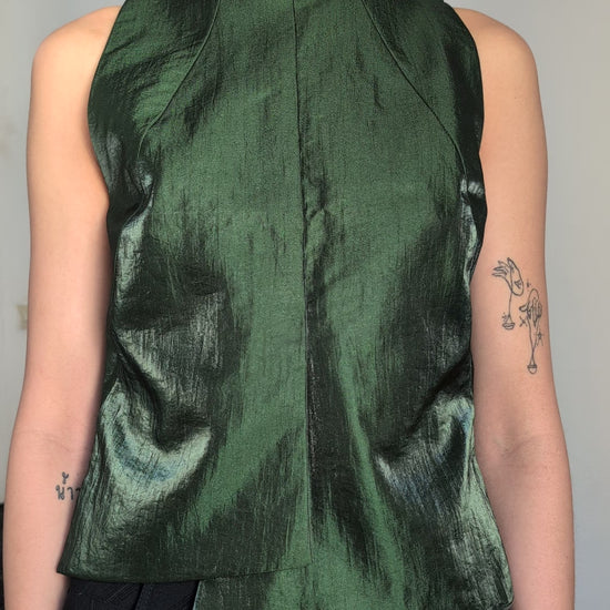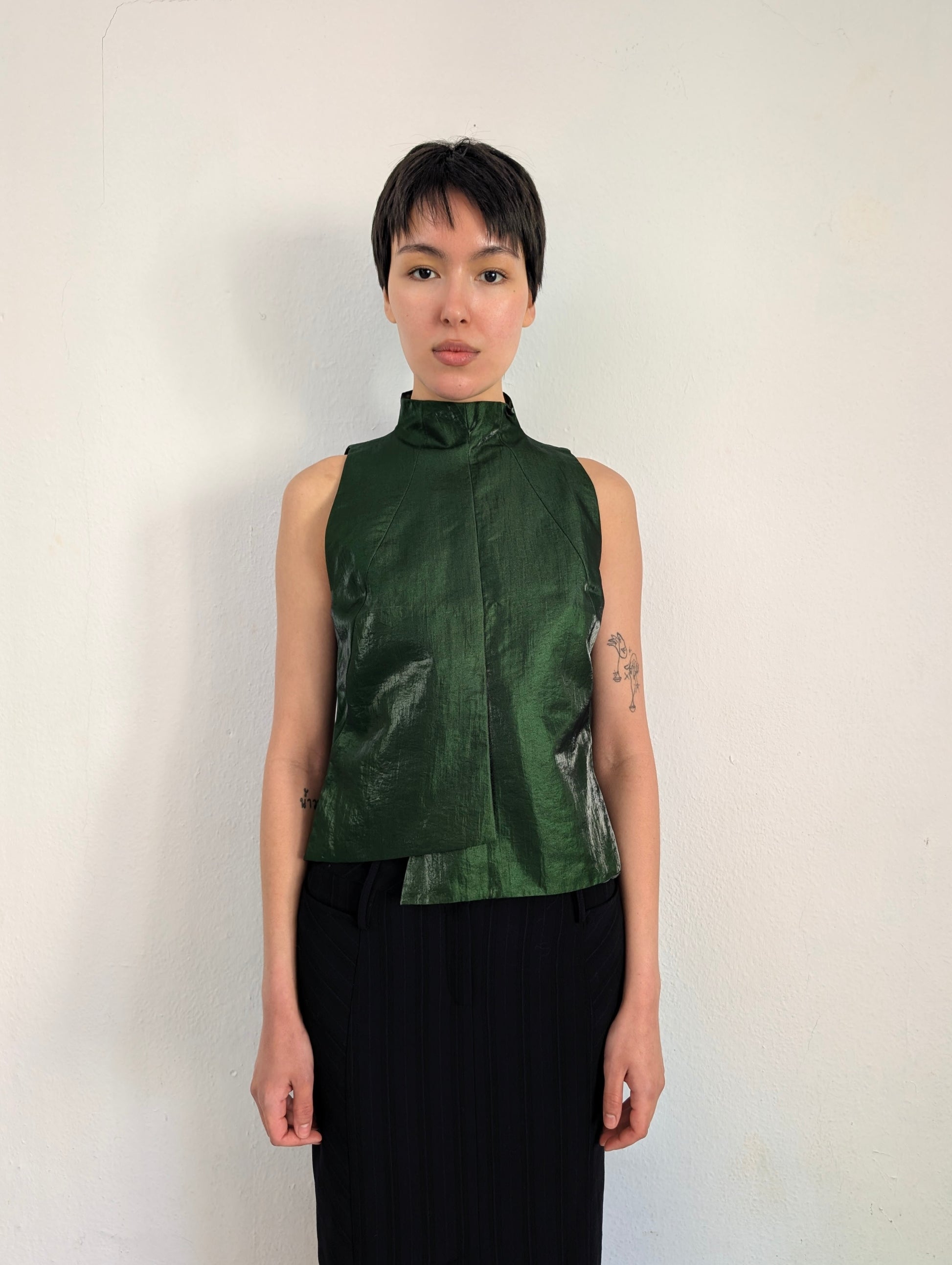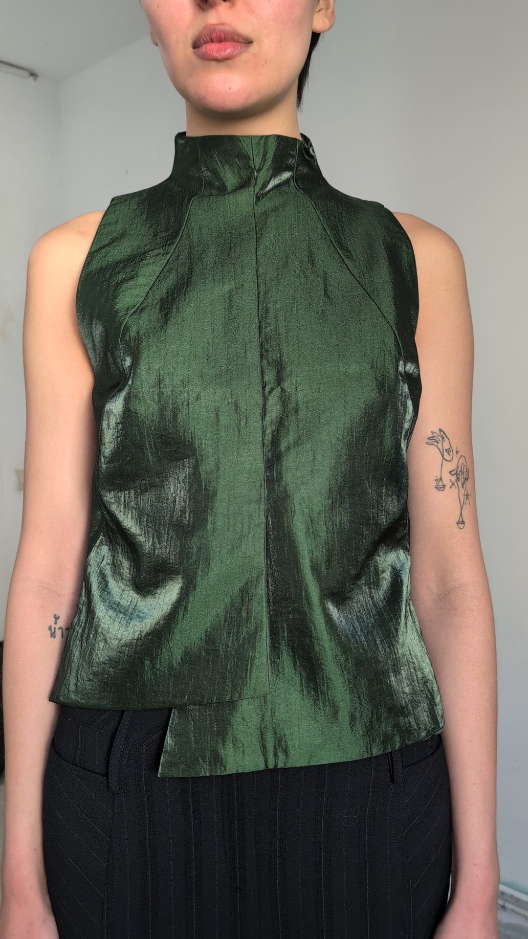 VINTAGE — This asymmetrical satin turtleneck channels the effortless look of late ’90s, blending minimalism with a futuristic edge. The deep forest green hue is elevated by a metallic shimmer effect, creating an almost liquid-like texture that catches the light beautifully. Featuring a high neckline and an asymmetrical hemline which adds a touch of avant-garde flair.