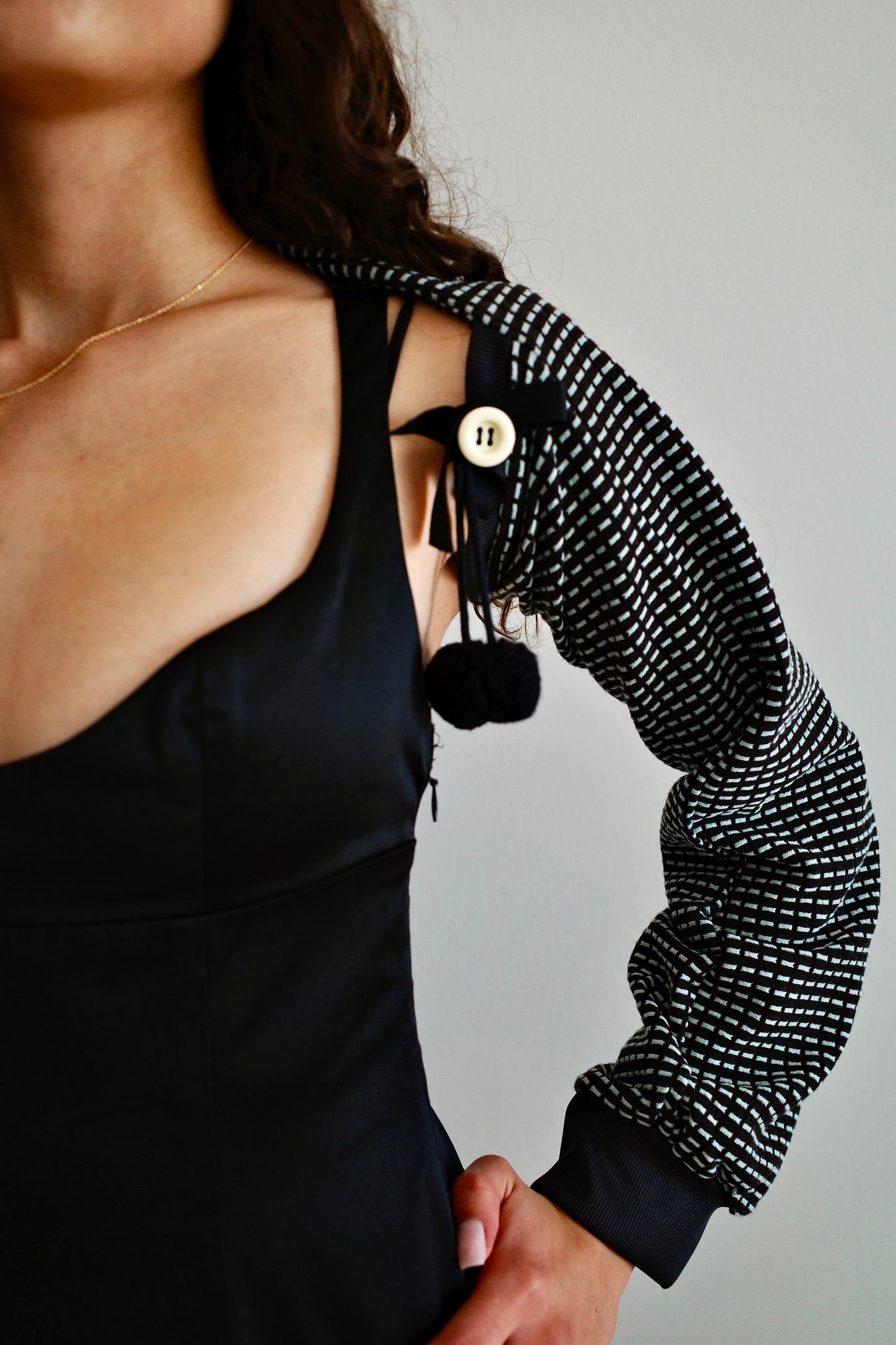 VINTAGE — unique black-and-white patterned sleeve piece that functions like a bolero. Features a soft woven texture with a distinctive button and tie detail at the shoulder.