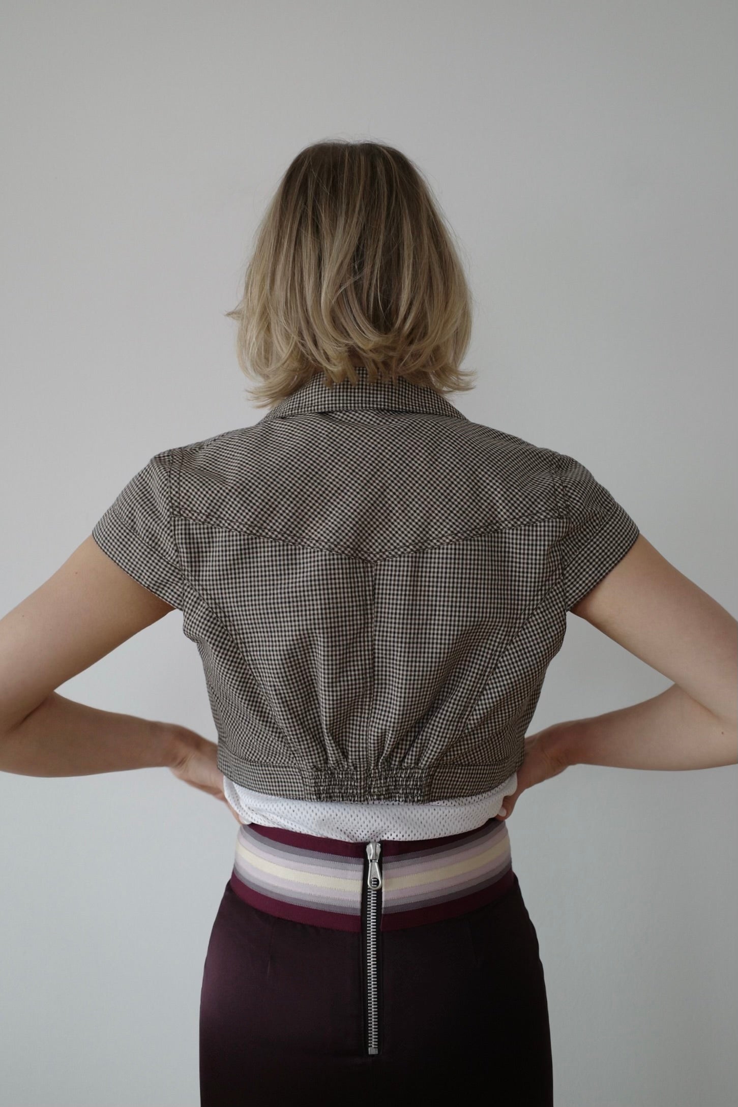Vintage — Cute cropped bolero in a tiny brown check pattern. The perfect layering piece for tees, dresses or high-waisted skirts. Fitted cut with slight gathering in the back for shape. Super easy to style and a great everyday vintage staple.