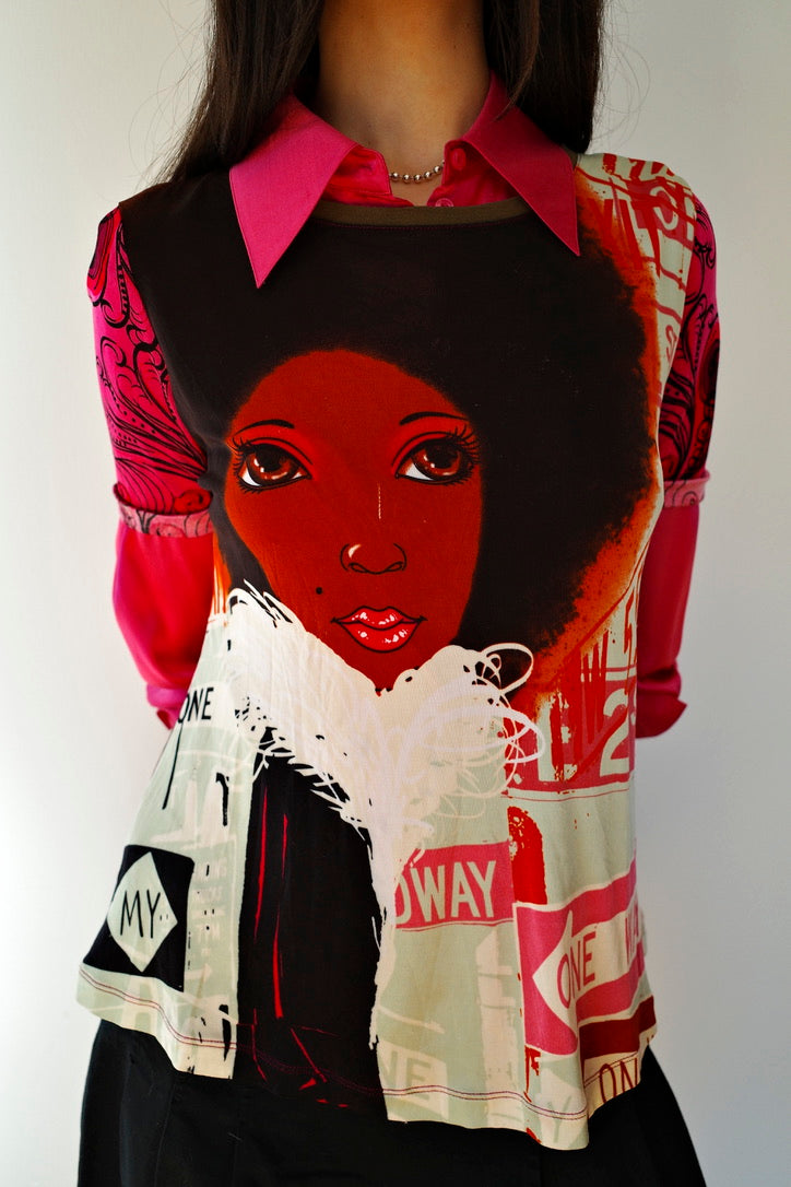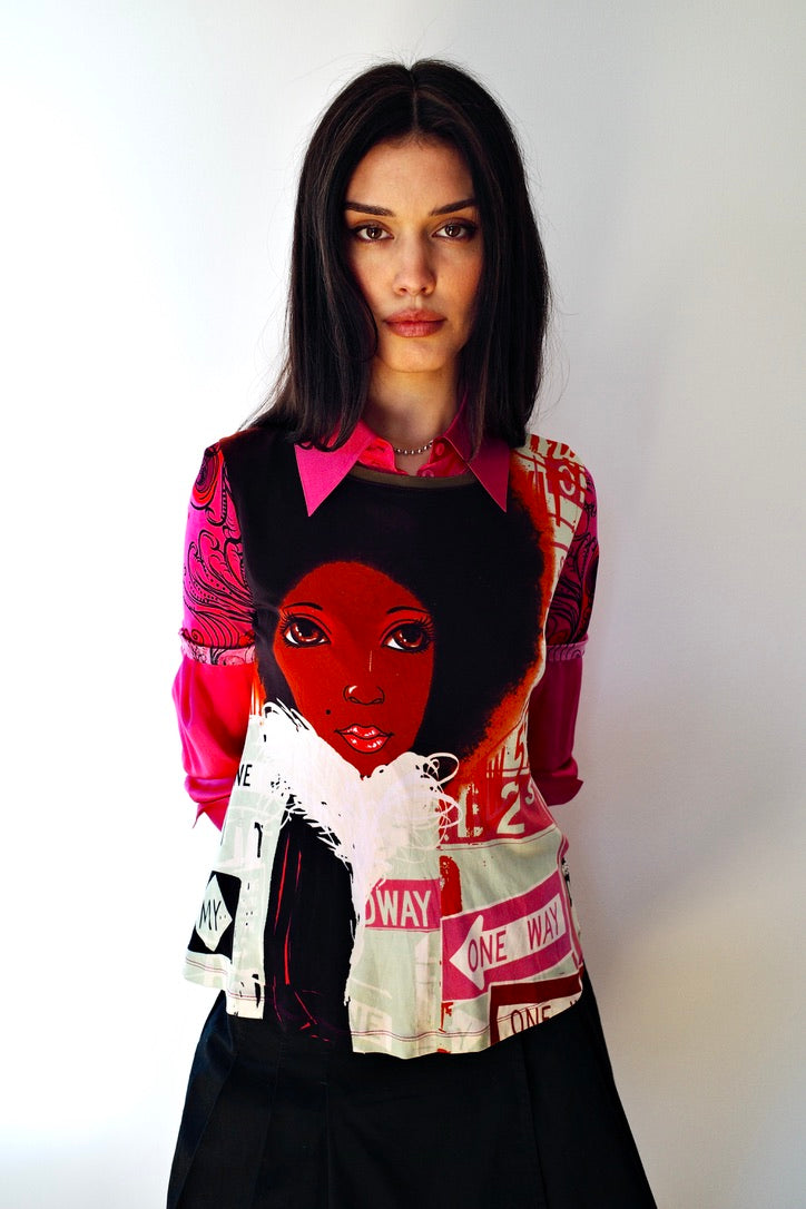 CUSTO BARCELONA — bold graphic print shirt featuring a striking 70s-inspired portrait design and vibrant red and pink tones. Smooth, lightweight fabric with contrasting patterned sleeves. A signature Custo piece.