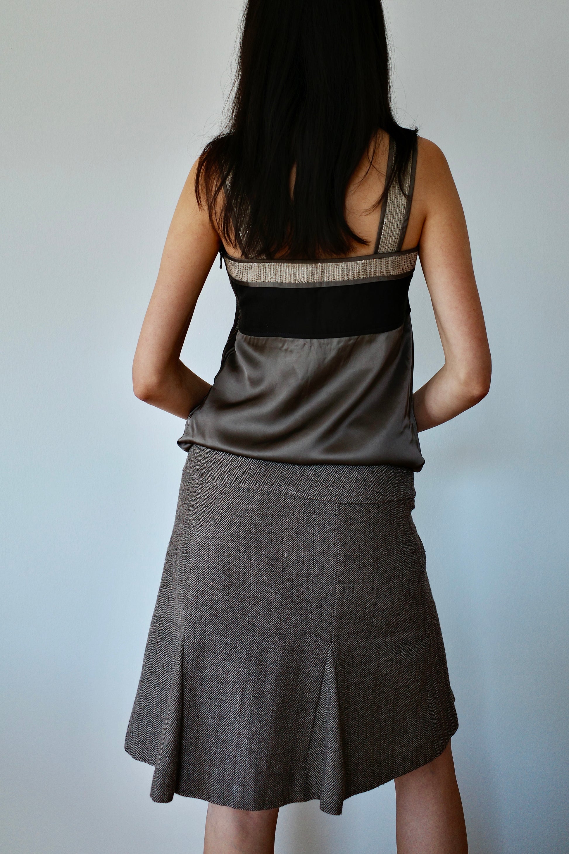 VINTAGE (Dickies) — tailored brown-grey wool-blend skirt featuring a subtle herringbone pattern and a decorative flower detail at the waist. The slightly flared cut offers a feminine twist on the brand’s utilitarian heritage, balancing structure with soft movement. A versatile piece ideal for both casual and polished looks.
