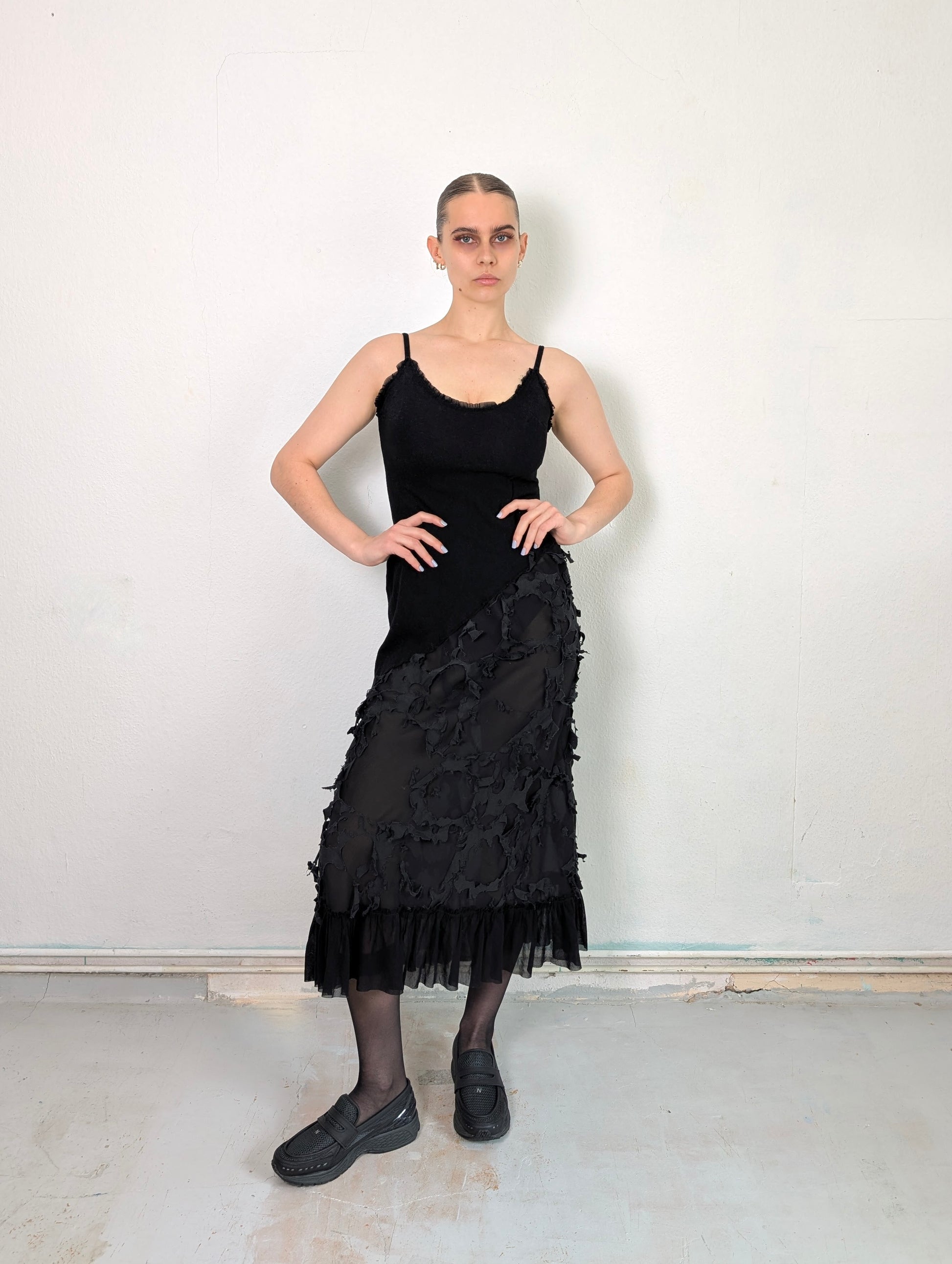VINTAGE — The dress exudes effortless 90s chic with its intentionally distressed holes, giving it an edgy look. Made from soft, comfortable fabric, this dress feels as good as it looks, offering a laid-back fit. The camisole design adds a touch of femininity and casual elegance, while the distressed details provide a unique twist.