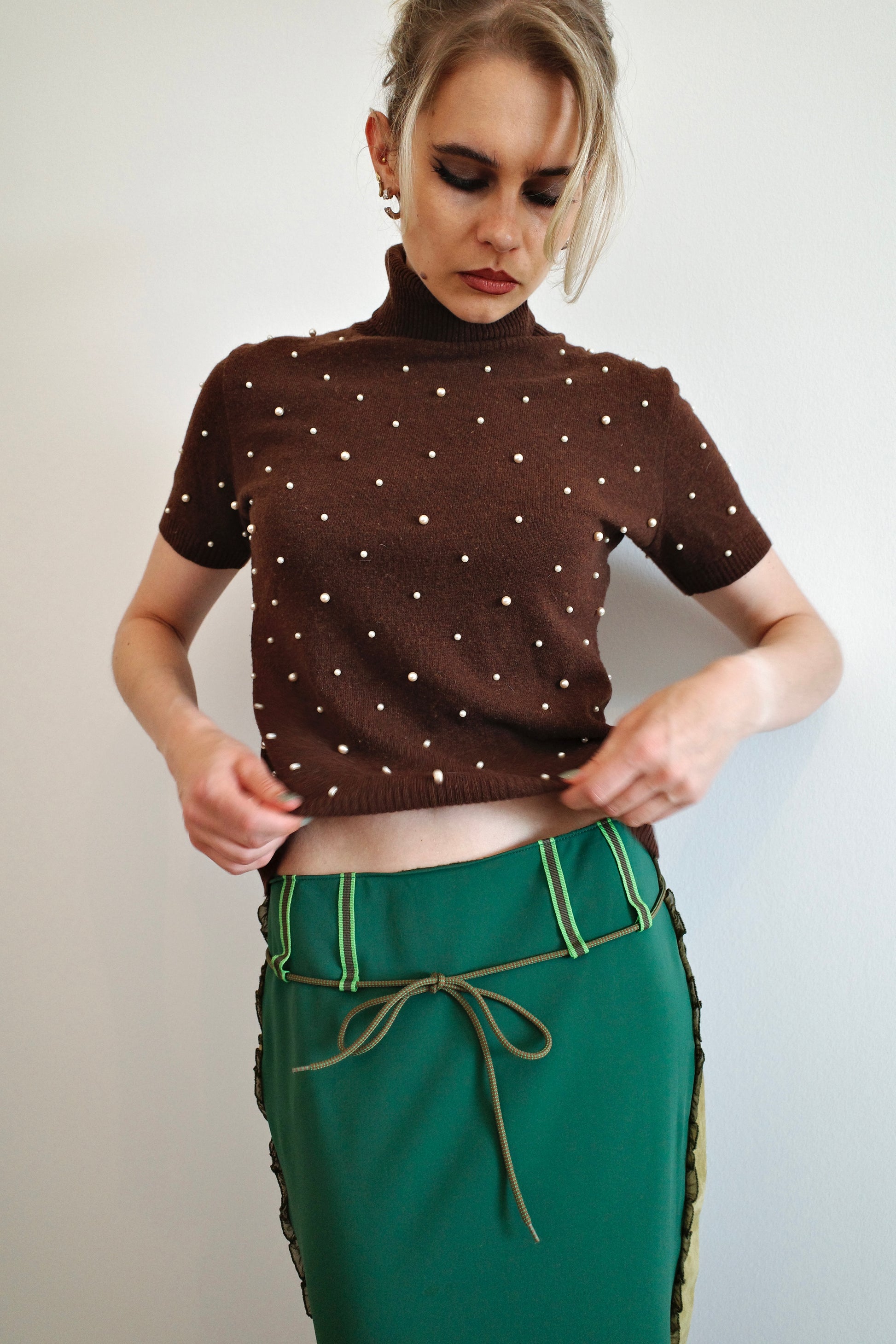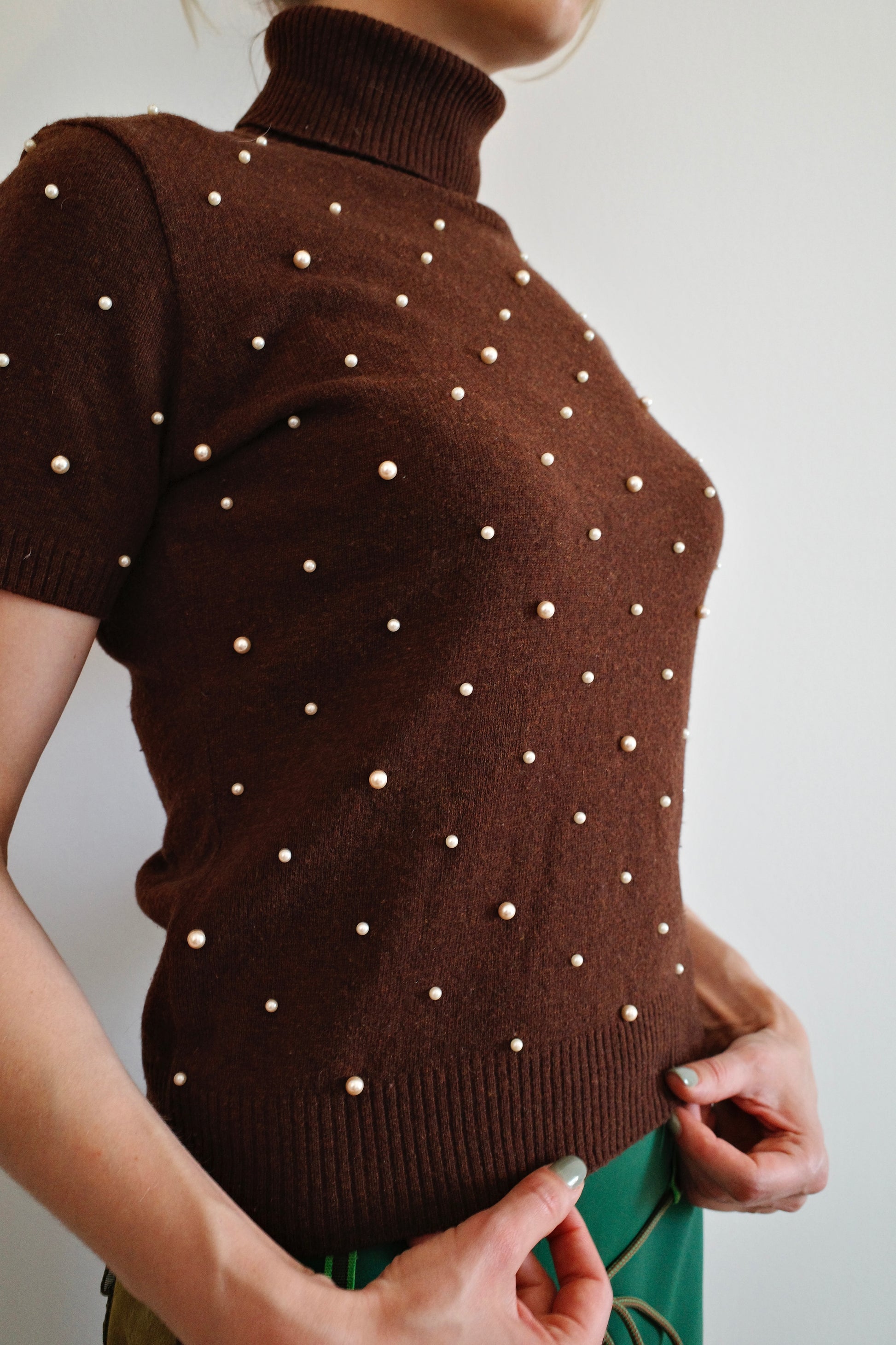 DOLCE & GABBANA — brown turtleneck with stunning pearl embroidery on the front and subtle logo placement on the back.