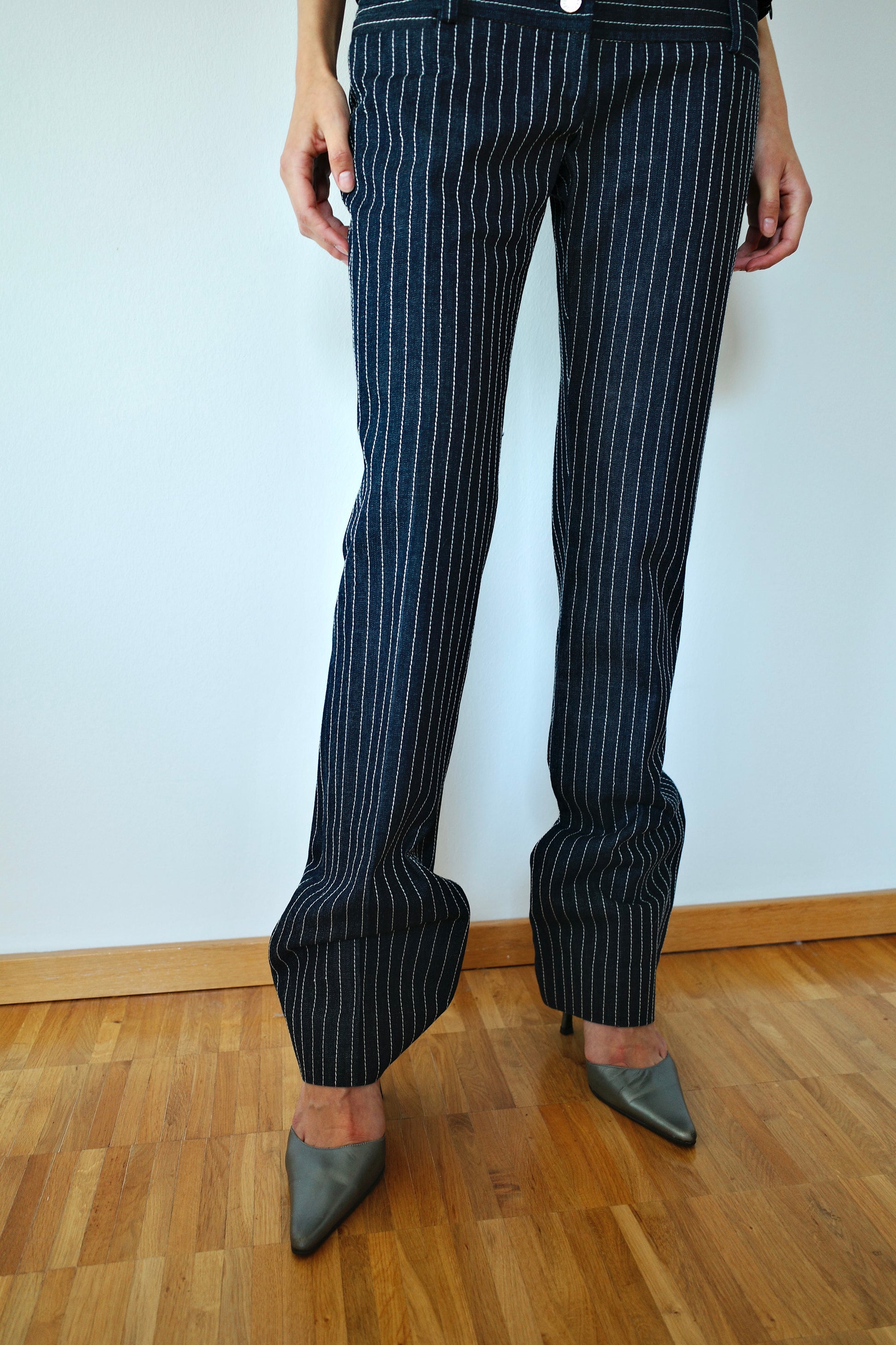 DOLCE & GABBANA — pinstripe denim jeans with a tailored twist. The dark wash is elevated by sharp white pinstripes and a double-button high waistband. A perfect blend of Italian luxury and Y2K edge, finished with a iconic Dolce & Gabbana logo plaque on the side.