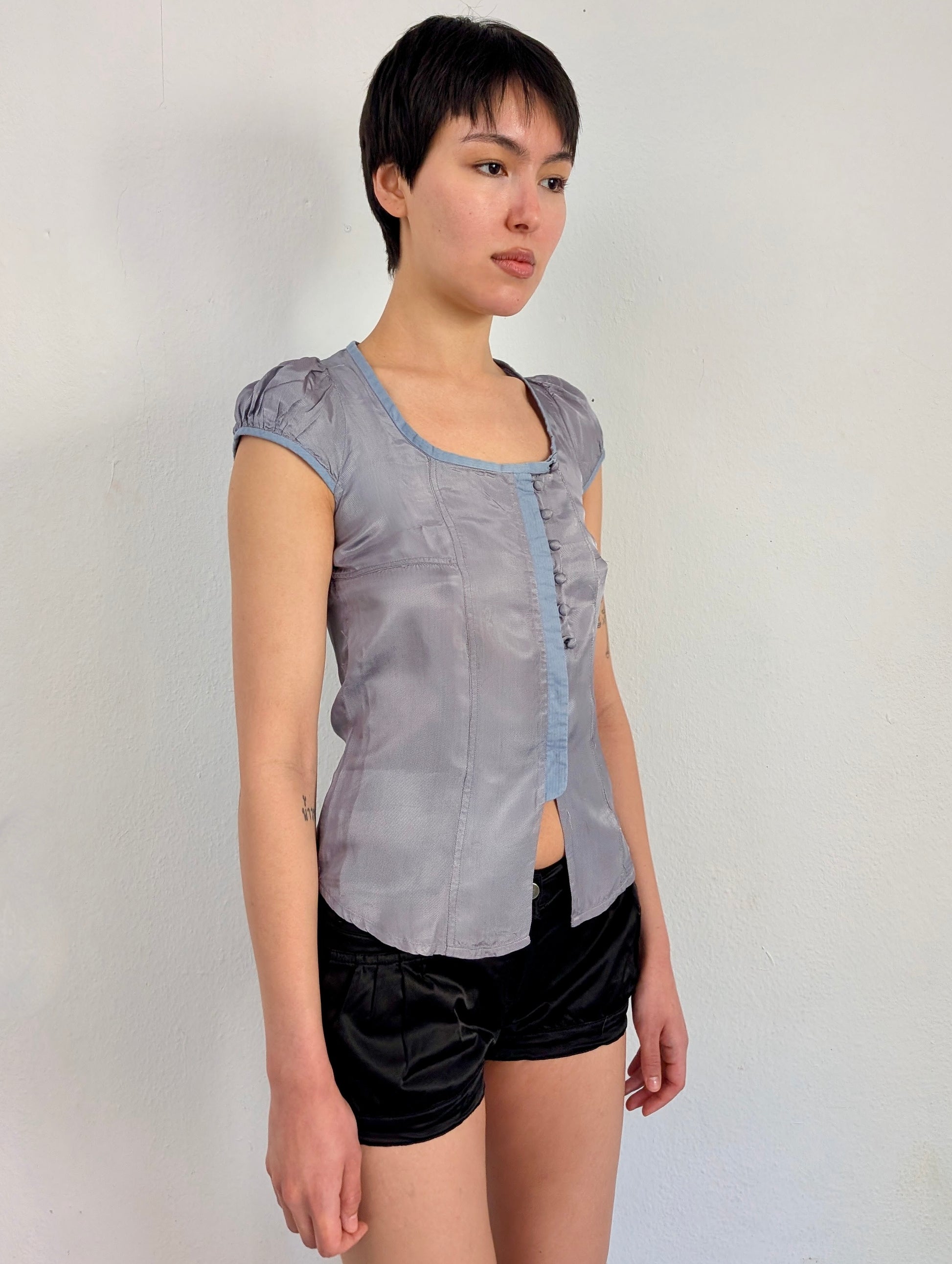 ISABEL MARANT — This Isabel Marant buttoned blouse comes in a soft, muted blue shade with a luxurious satin finish that adds an elegant sheen. The blouse features a subtle short puff sleeve and an asymmetrical button hem, giving it a unique, sophisticated touch. Perfect for pairing with tailored trousers or denim for a chic, effortless look
