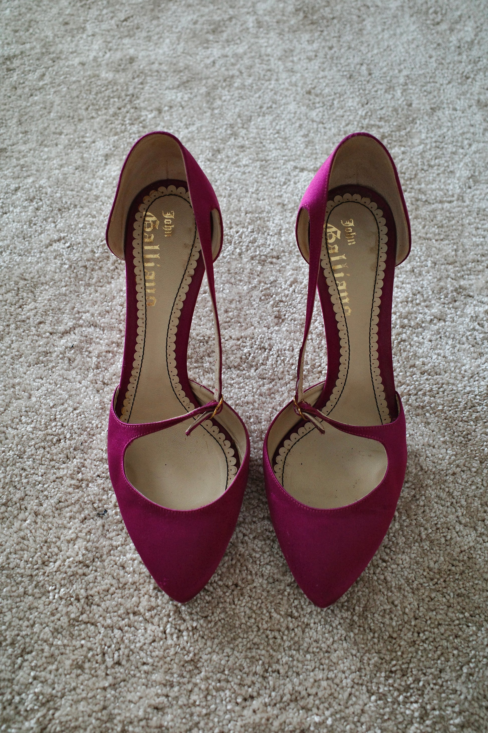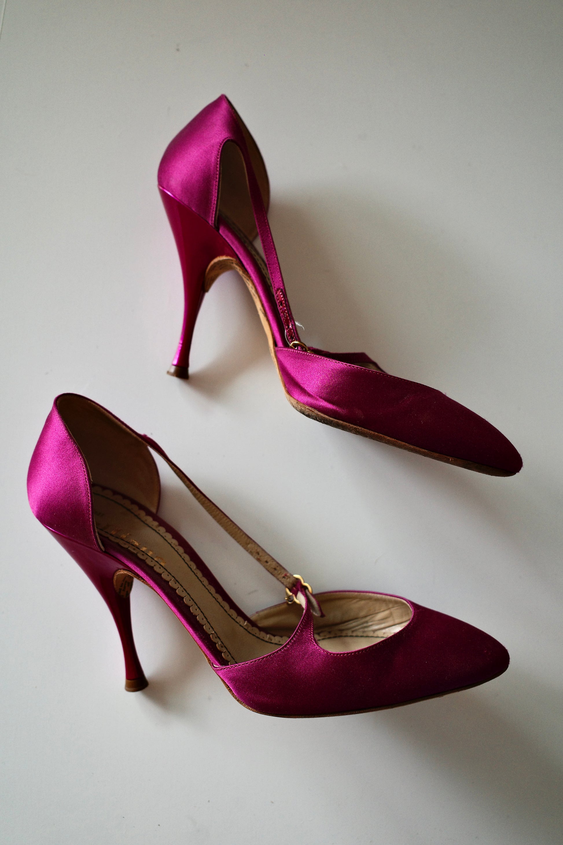 JOHN GALLIANO - Striking hot pink satin pumps featuring a gold-plate detail und the cross-over strap and a sensual cleavage cut. A bold statement of refined glamour. 100% Carrie Bradshaw.