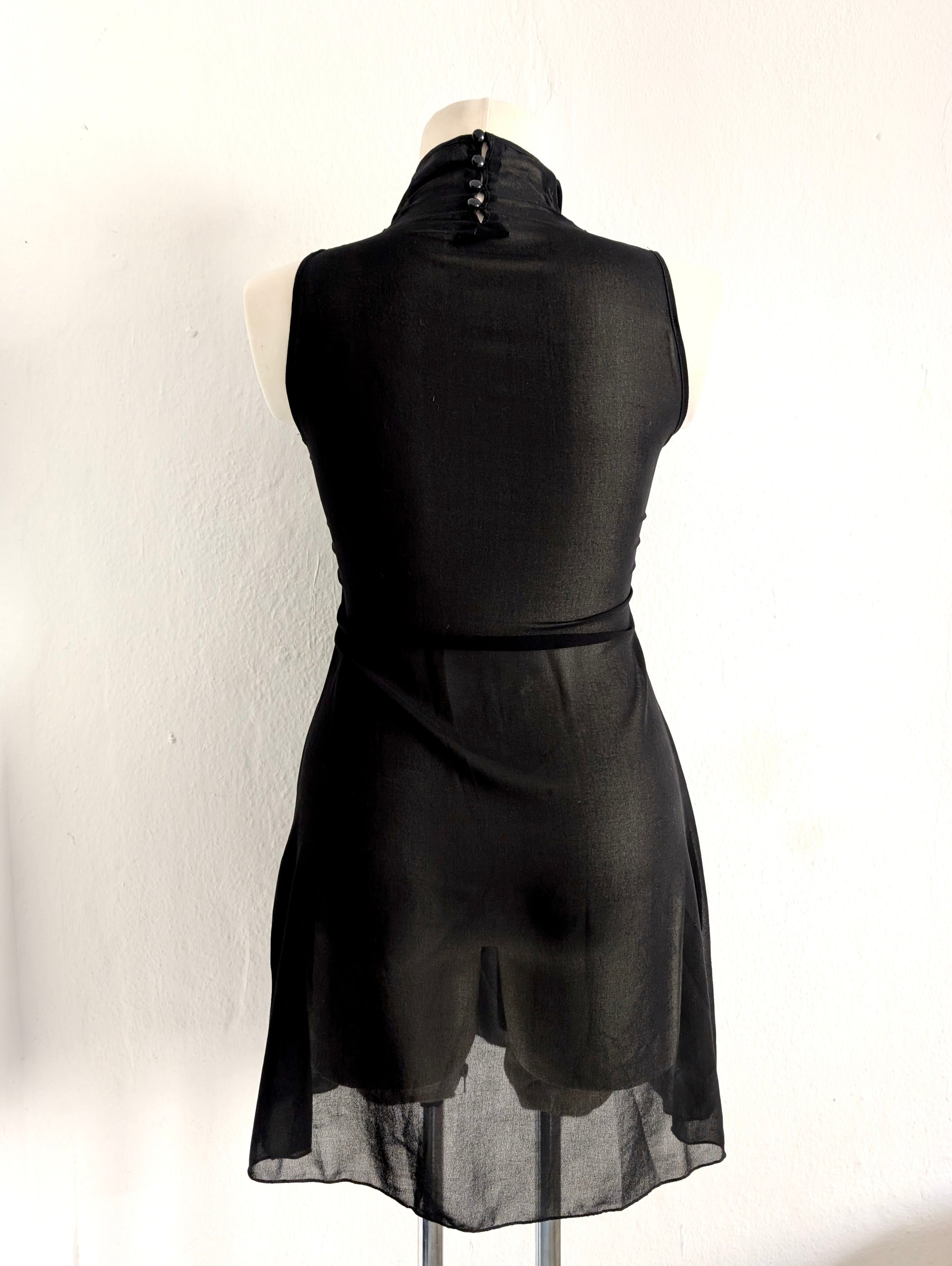 this dress is a bold, avant-garde piece with a sleek turtleneck design. Made from a black sheer fabric, it offers a daring, see-through look that’s both edgy and stylish. The front is adorned with pretty satin band details, adding a touch of refinement to the otherwise minimalist silhouette. The combination of the sheer fabric and the satin bands creates a striking contrast, making this dress perfect for those who appreciate fashion with an unconventional, artistic flair.