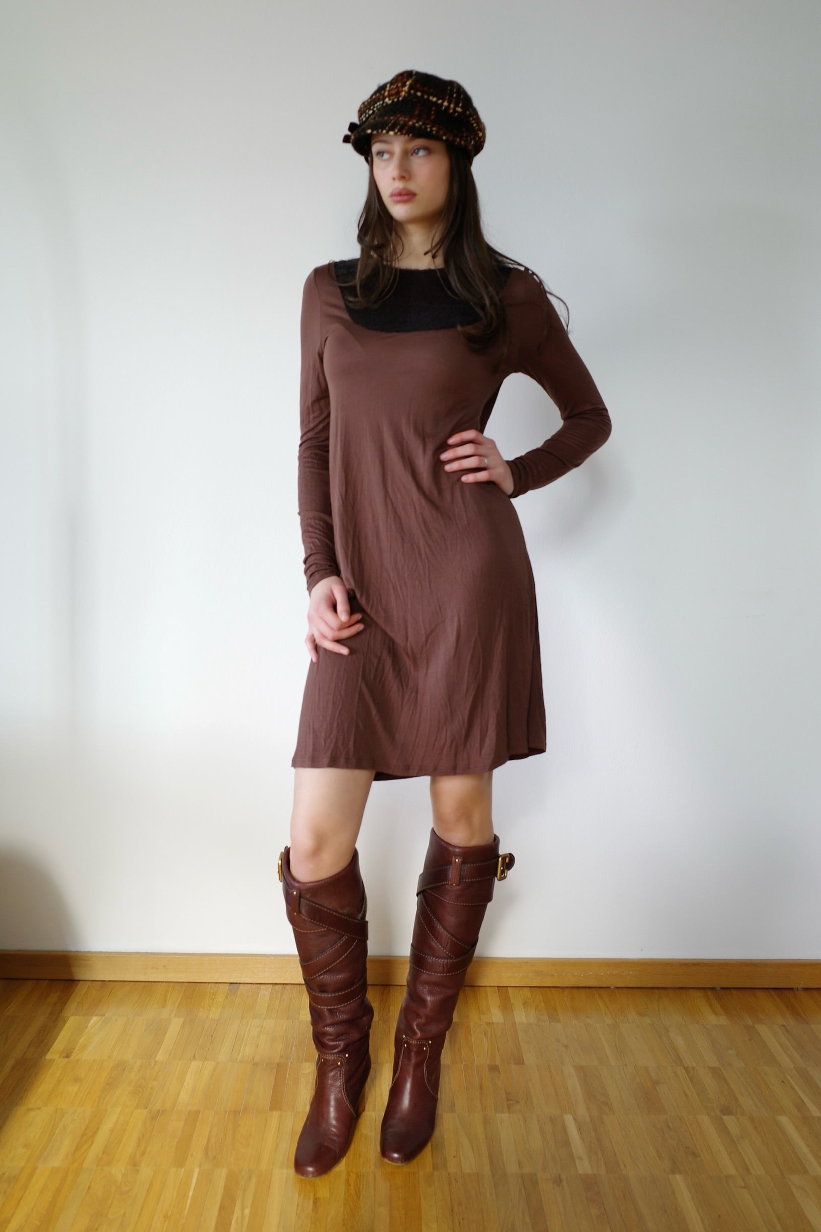 Elegant midi dress by Mais Il Est Où Le Soleil ? featuring a minimalist silhouette with a distinctive sequin-embellished bust panel. The soft brown fabric contrasts beautifully with the dark shimmering neckline detail, adding subtle texture and visual interest. Designed with long sleeves and a clean, fluid shape that drapes comfortably along the body, making it an effortless piece for both casual and evening styling.