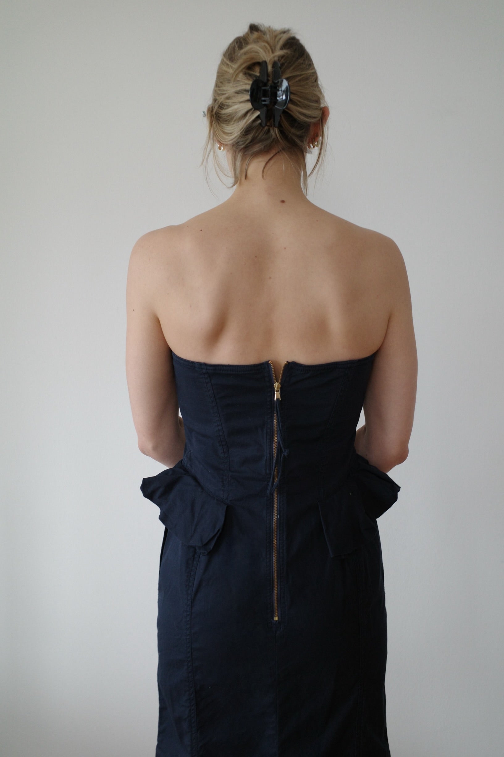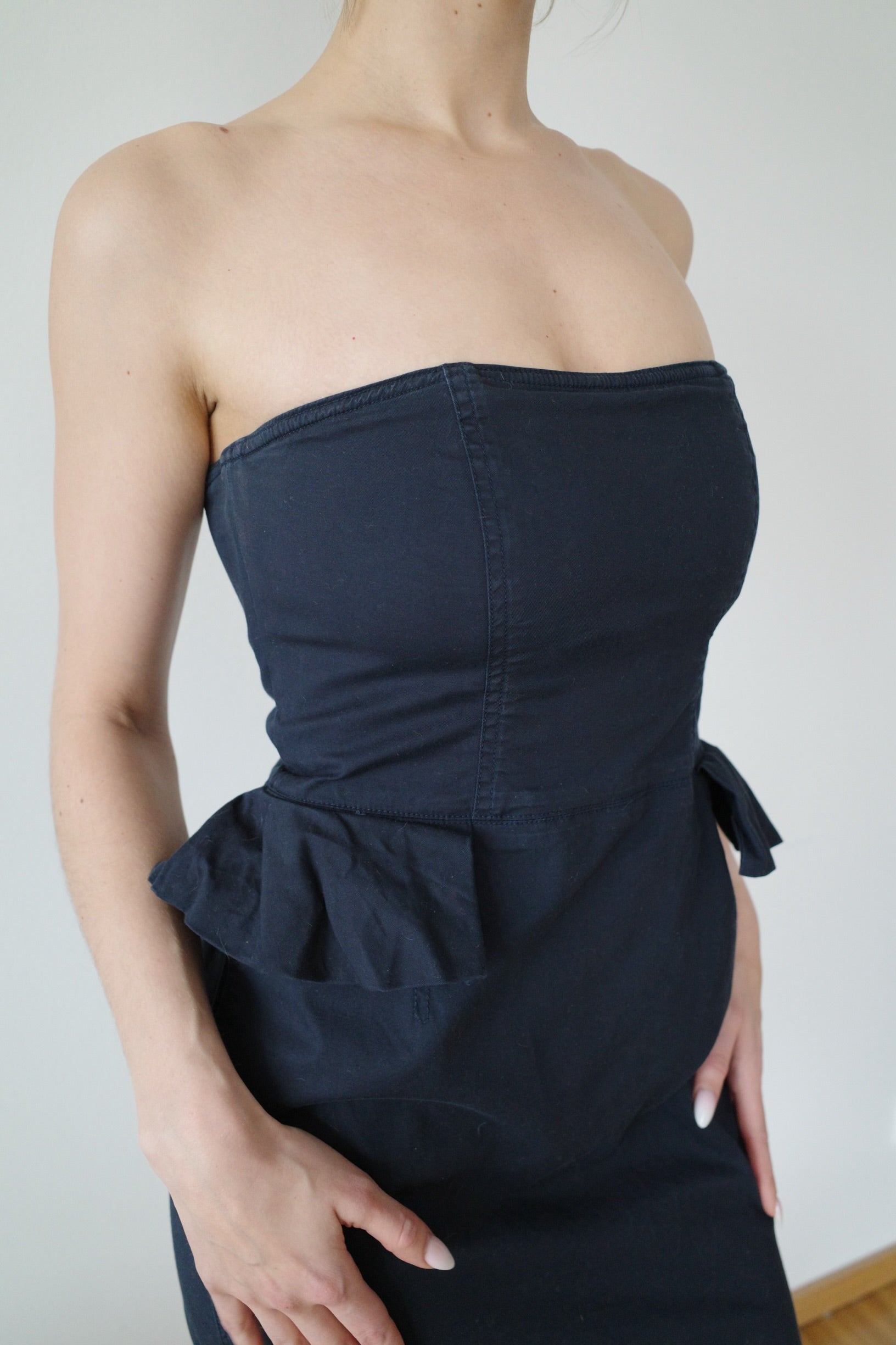 Marc Jacobs - Chic and minimal Marc Jacobs strapless dress in a deep navy tone. Features a fitted silhouette with soft peplum-style side details and slight stretch for comfort. Perfect for elegant evenings or elevated daytime looks.