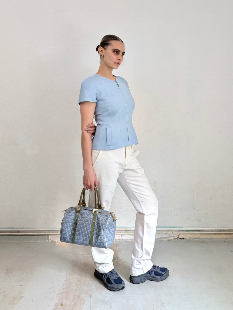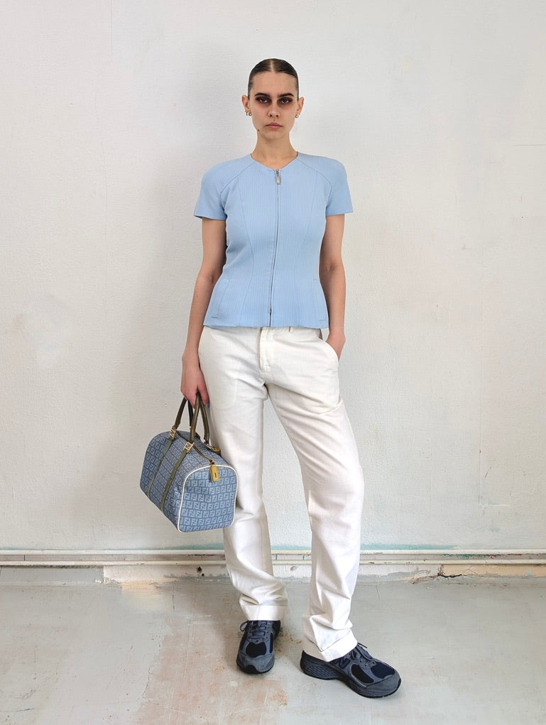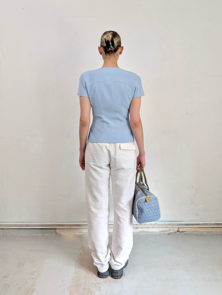 MUGLER - This tailored vest comes in the cutest baby blue color, adding a playful vibe to the sophisticated silhouette. It features a metallic zip closure in the front and a slightly tailored fit around the waist, beautifully accentuating the body's natural shape. It embodies Mugler's signature craftsmanship and timeless style.