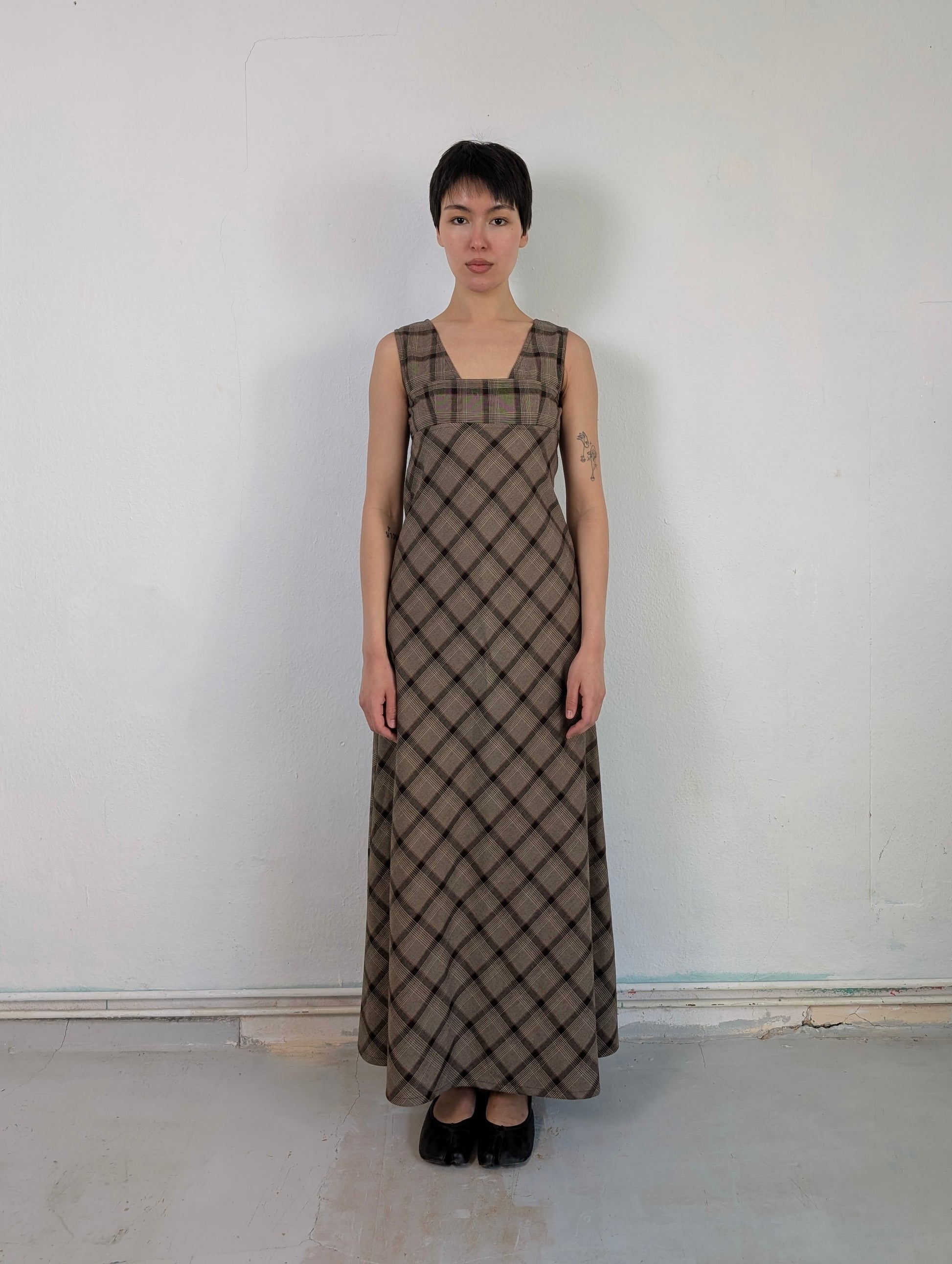 VINTAGE — Plaid Print Maxidress, channeling librarian core, but in the best way possible. Featuring a brown checkered pattern and an extra-long maxi cut, this dress gives off major 90s art teacher. Pair it with sneakers for a cool, contrast look that blends vintage charm with modern edge.