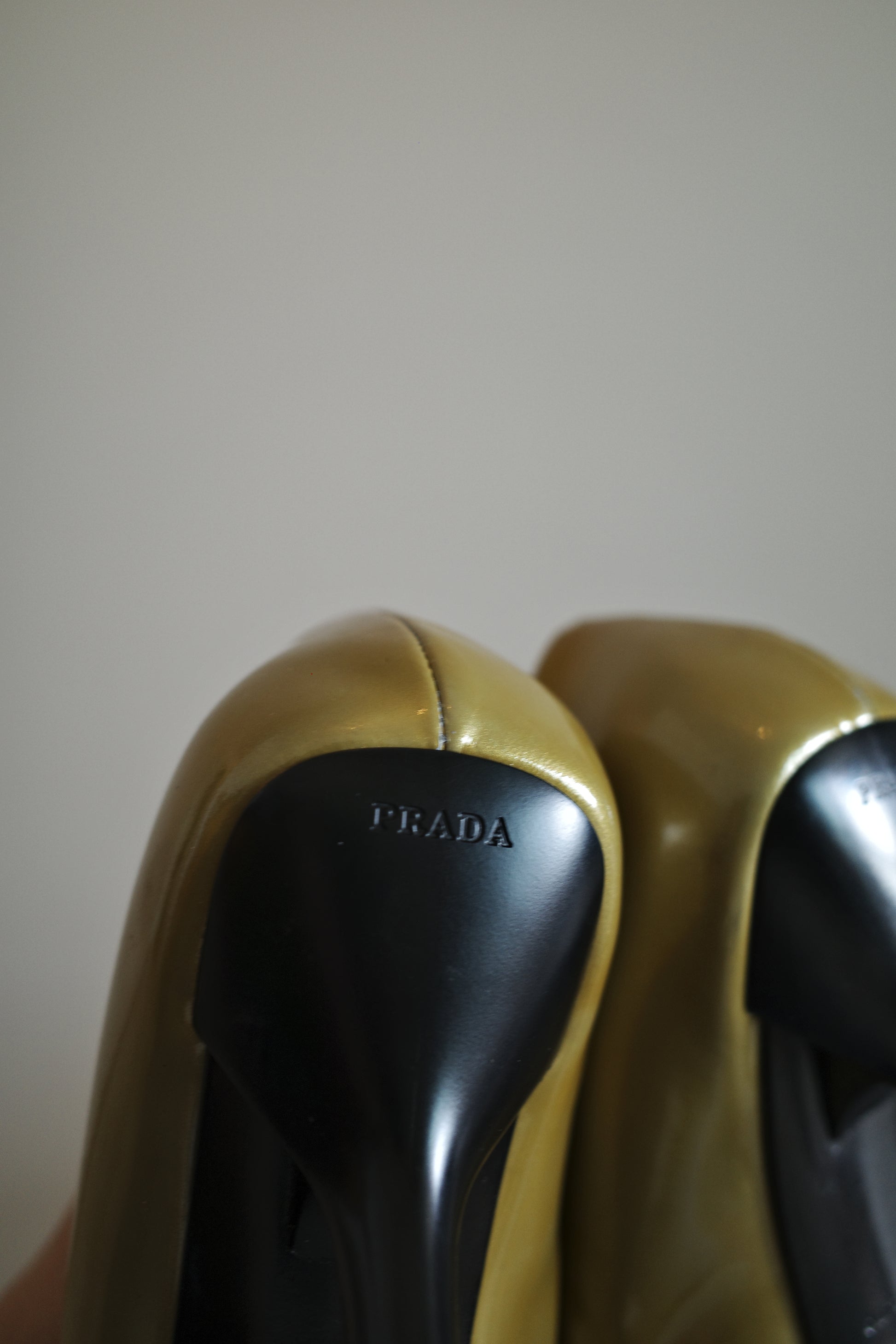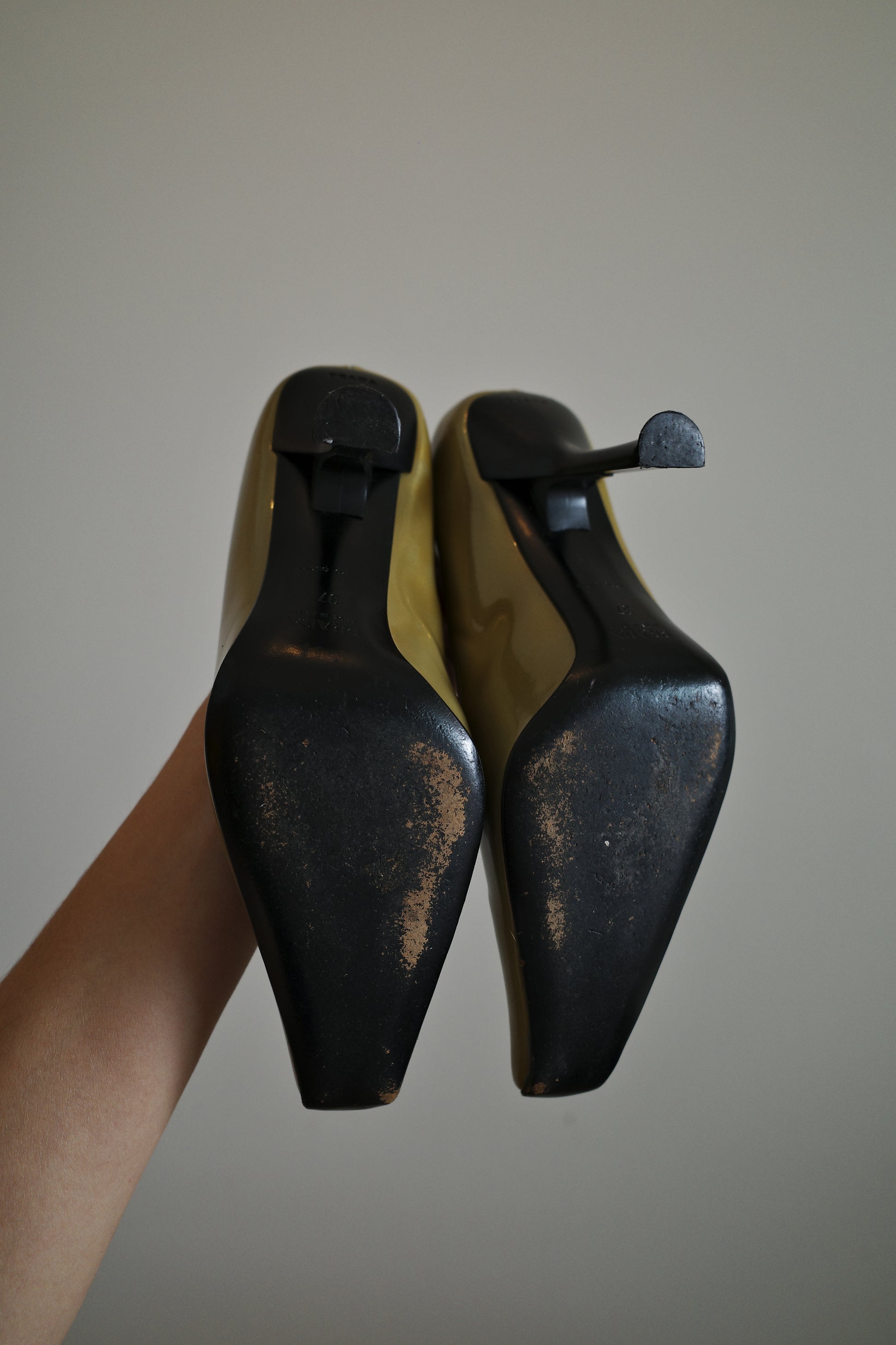 PRADA — apple green patent leather pumps with stiletto heel and a pointy, yet squared toe, very typical silhouette for 90's Prada footwear.