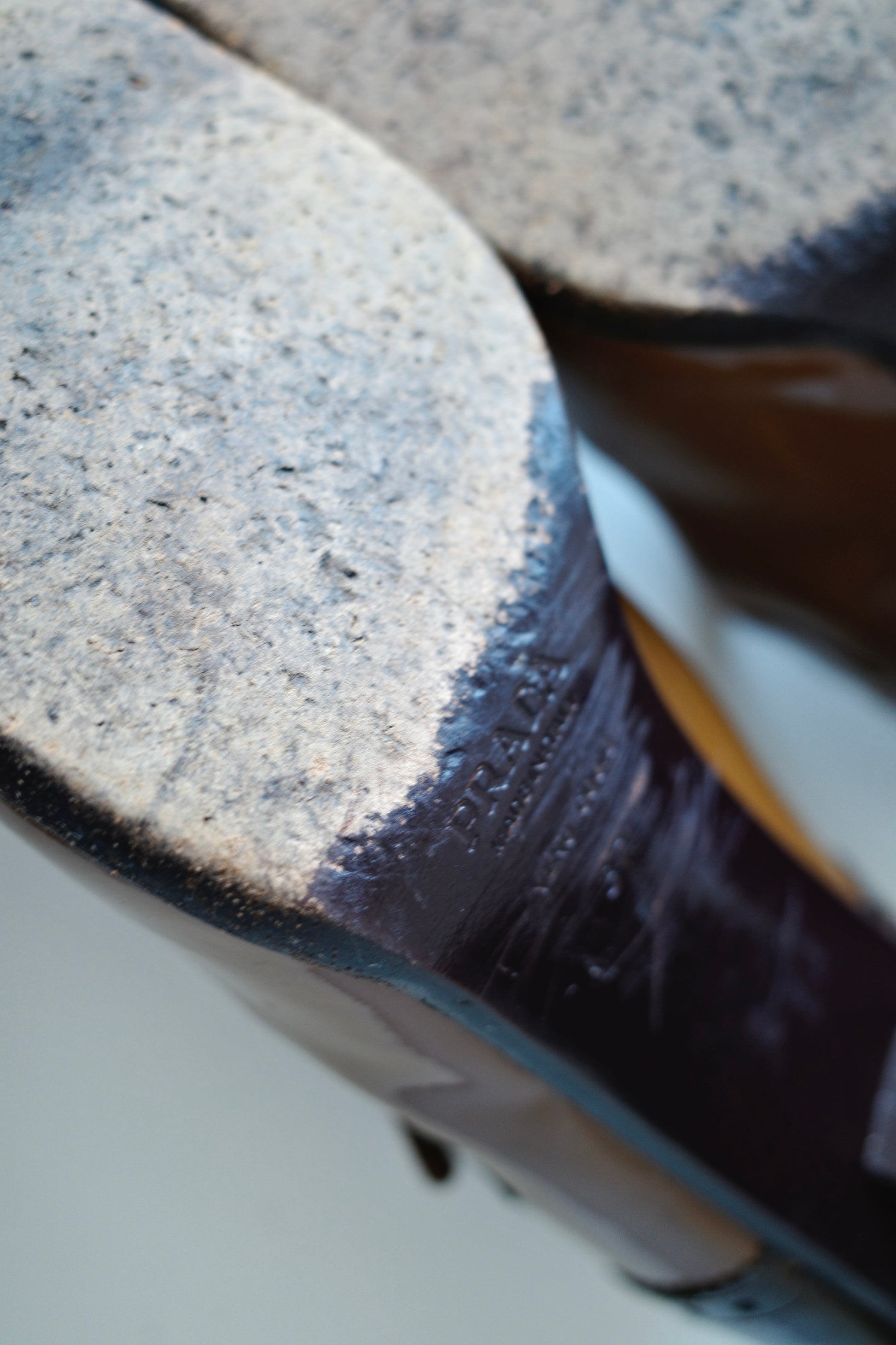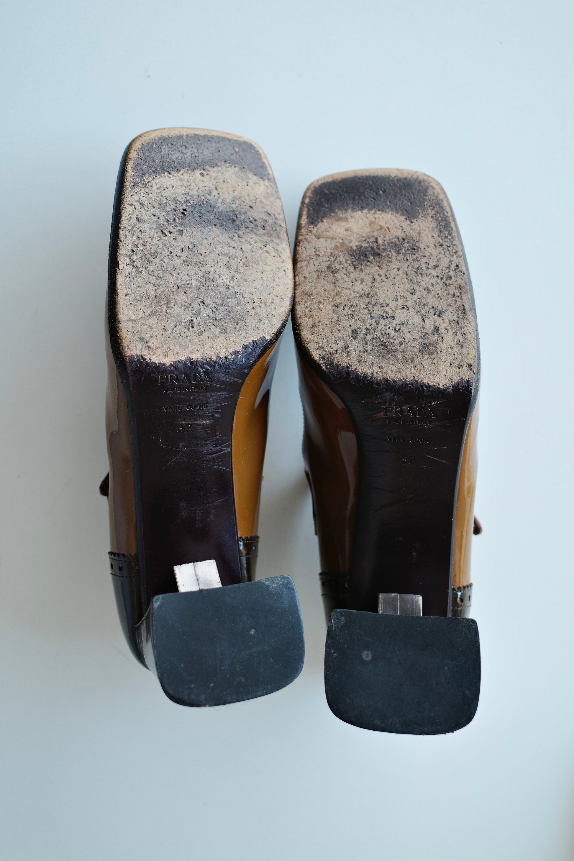 PRADA — Rare Mary Janes from Prada’s Fall/Winter 1999 collection. Glossy brown/mocca patent leather, featuring a square toe, cut-out details at the front and a sturdy block heel. A perfect balance of retro elegance and timeless design. Super comfortable and suitable for everyday wear or more polished looks.