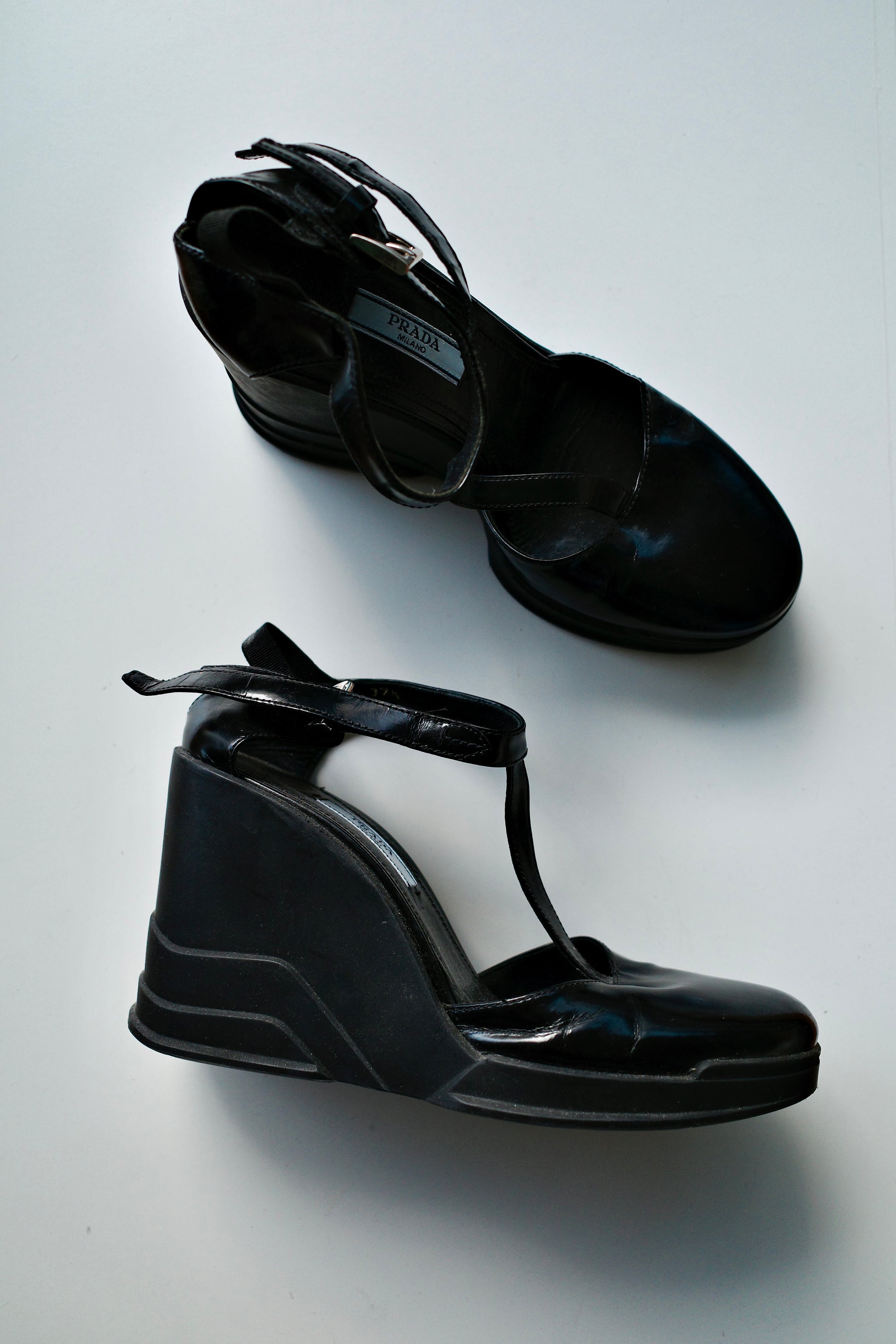 PRADA — iconic black leather wedges with a T-strap and a sporty wedge sole.
