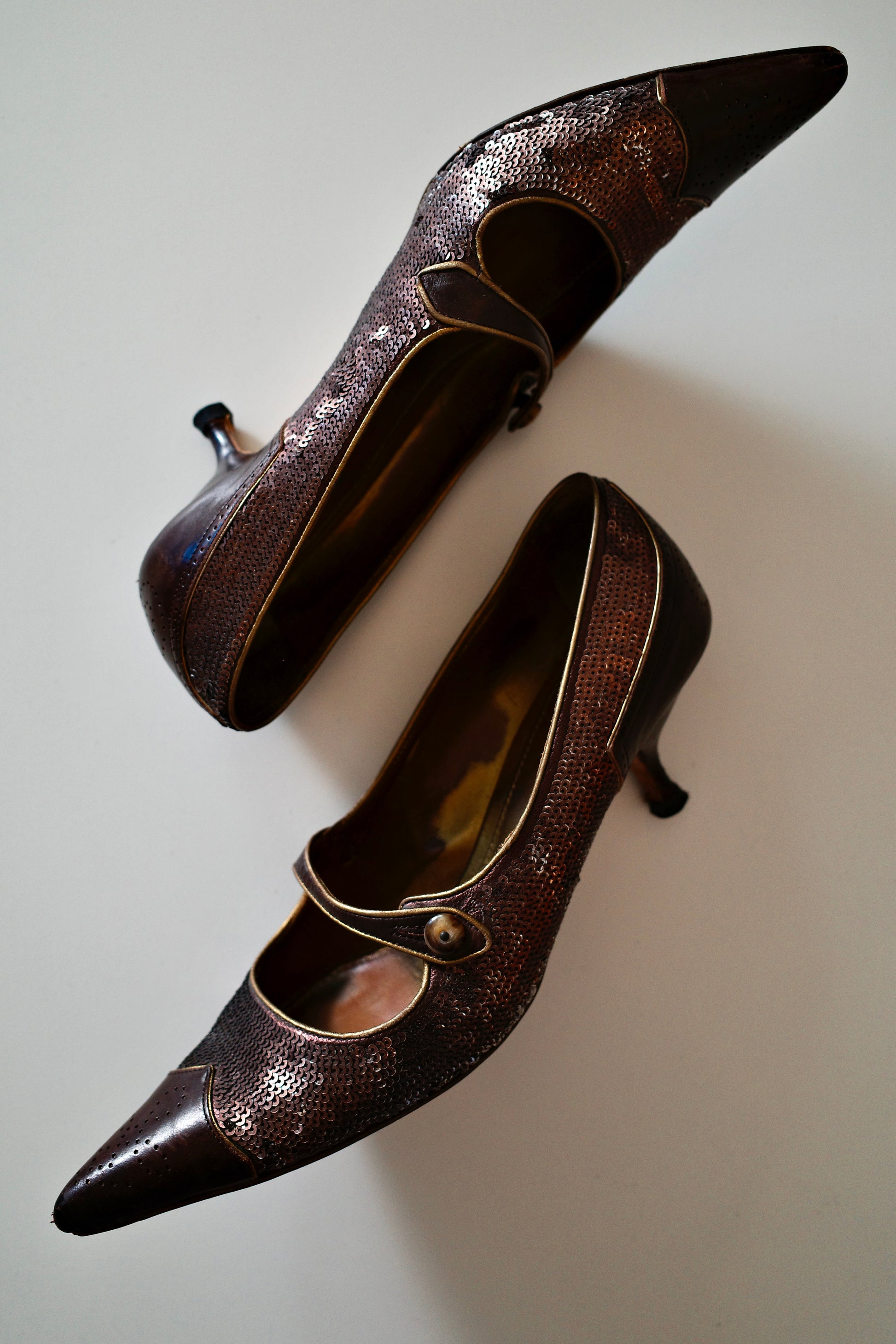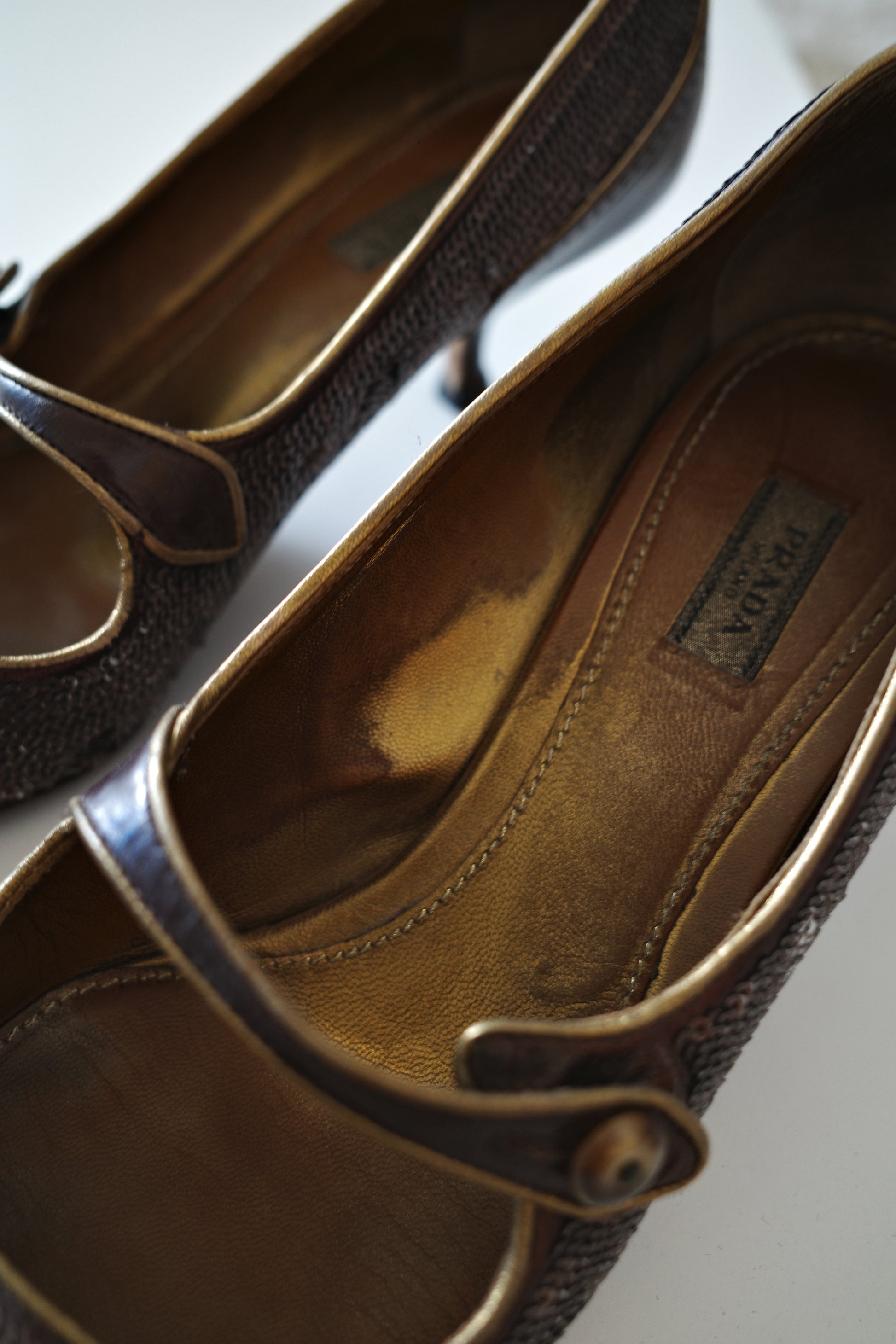 PRADA — probably late 90s/2000s. Oxfordstyle Mary-Janes with a brown leather pointed toe and metallic bronze sequin upper and a strap with button closure.