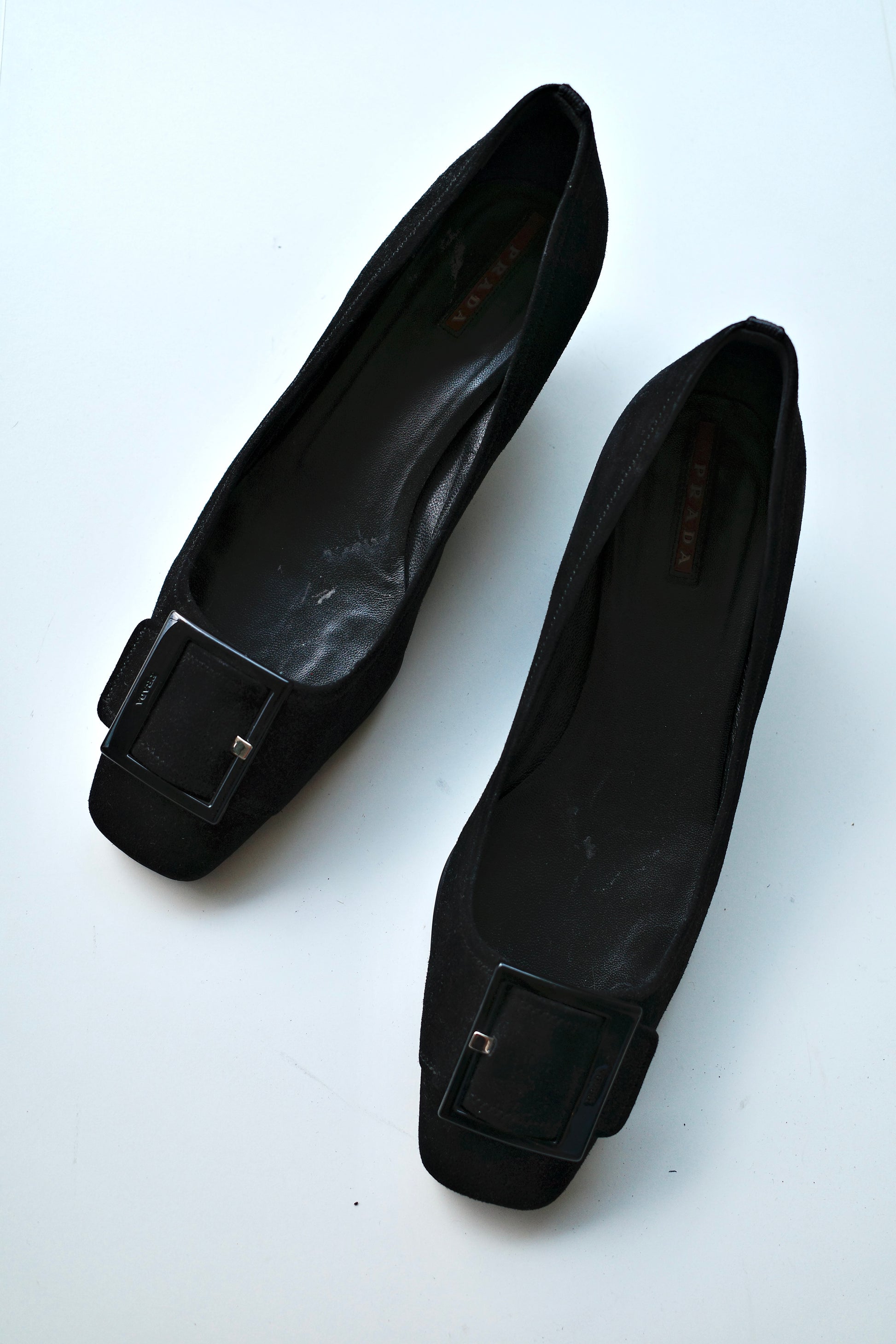 PRADA — Suede sneaker ballerinas with a small kitten heel and a sporty sole.