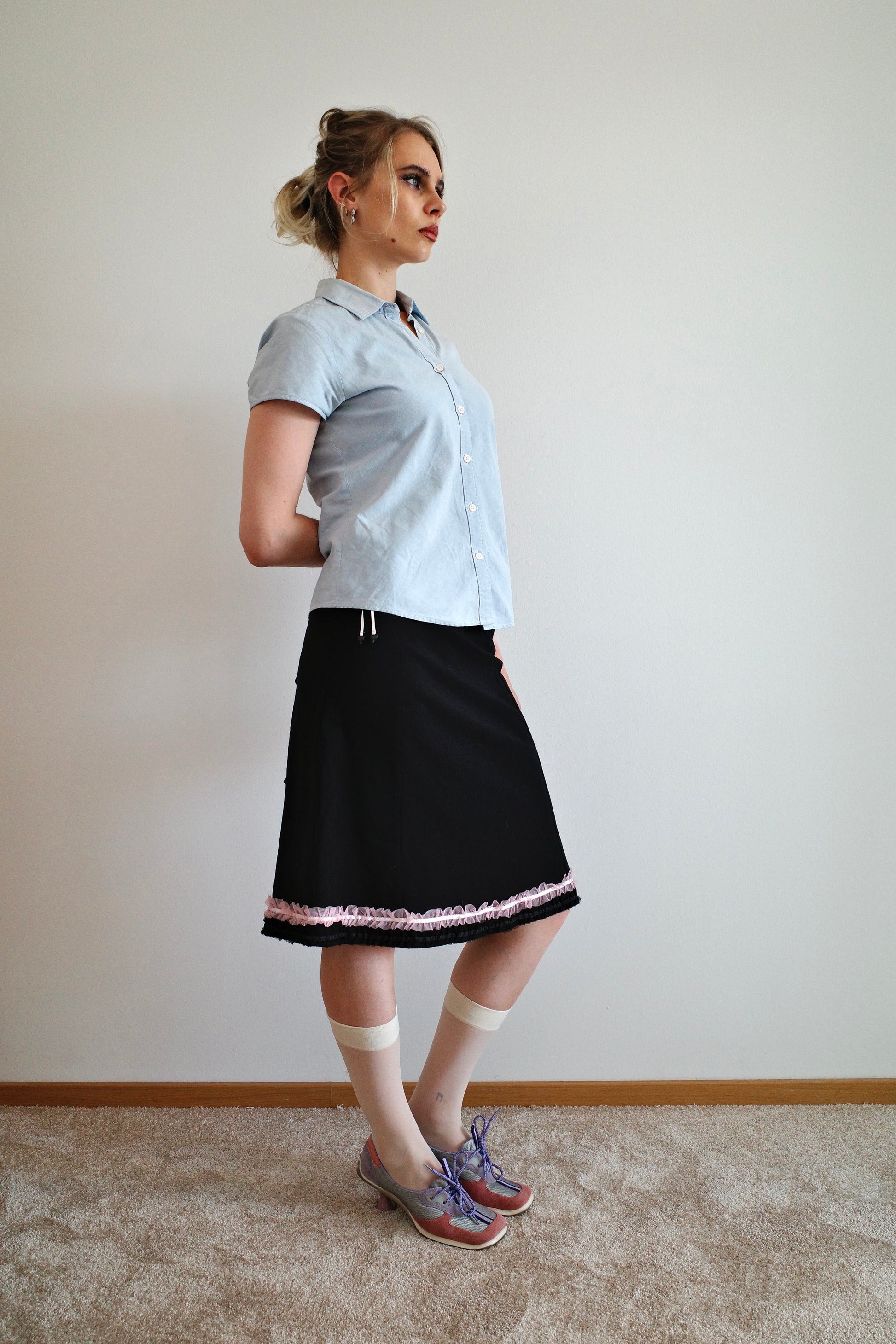 PUSSY DELUXE - Kawaii Skirt in black with soft lilac ruffles on the hem for a girly look. The Pussy Deluxe "cat" logo sits on the hip, while the mesmerizing back showcases a corset-style silk lace-up detail, adding a sexy and eye-catching element.