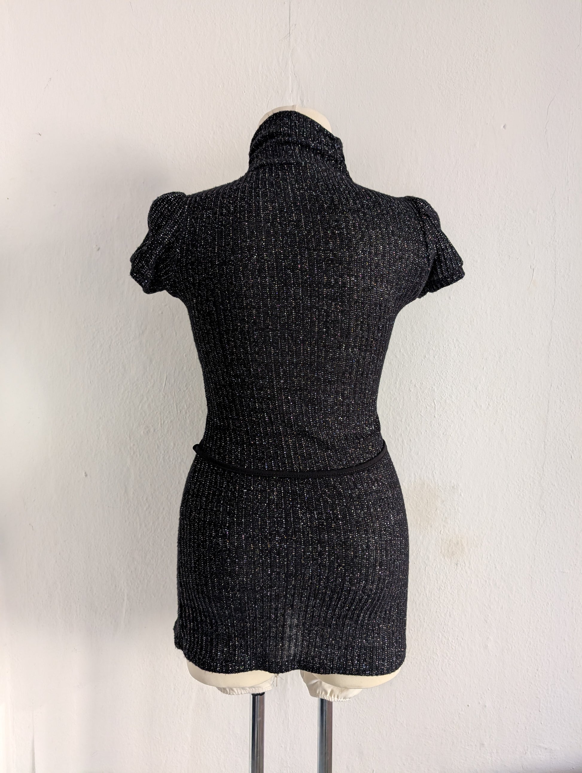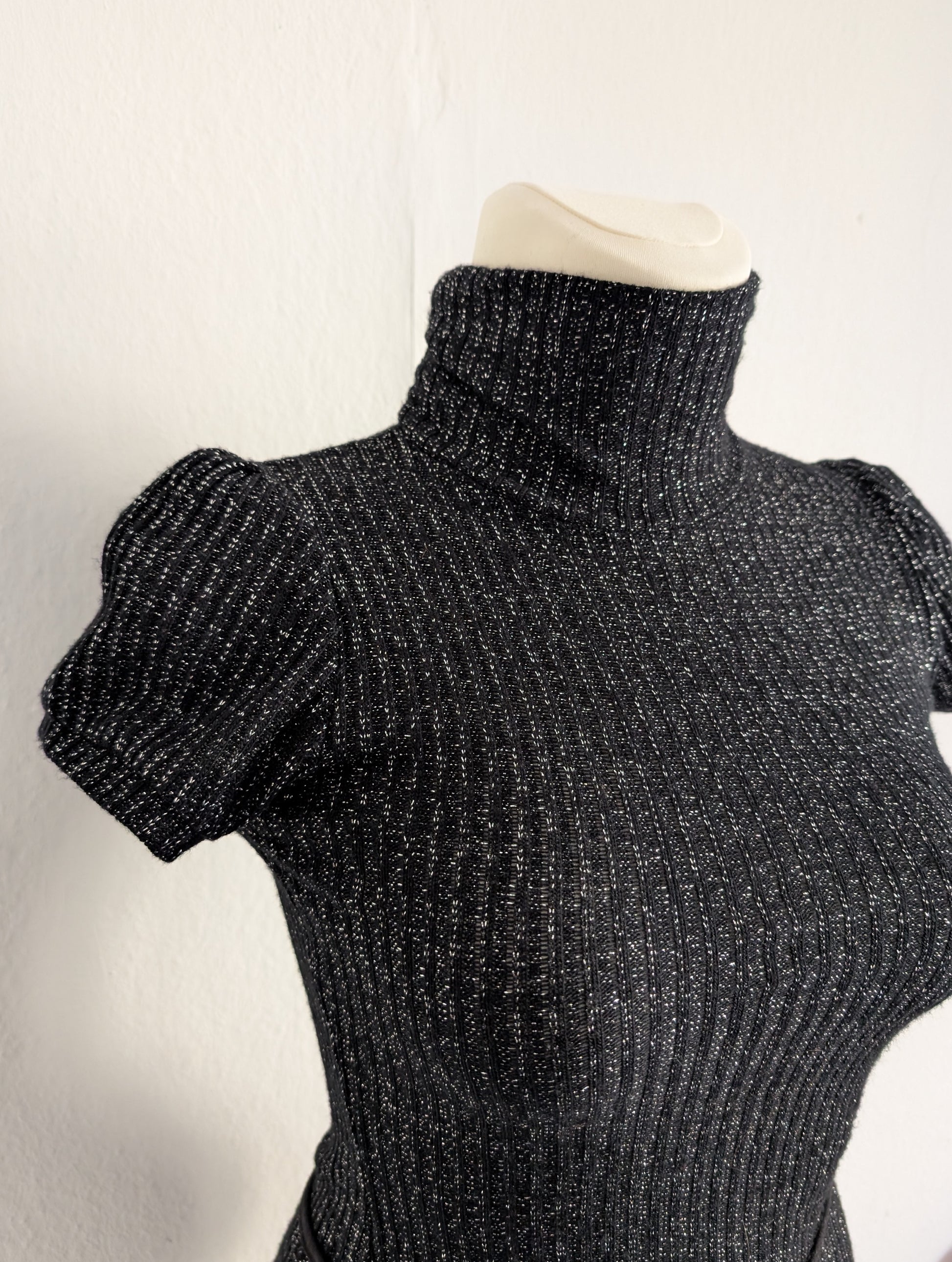 VINTAGE — This piece is a figure-hugging, ribbed knit dress with a subtle shimmer, adding a touch of glam to its sleek black design. Featuring a high turtleneck and delicate puff sleeves, it blends vintage inspiration with a modern edge. The fitted silhouette is accentuated by a thin black belt, enhancing the waistline.