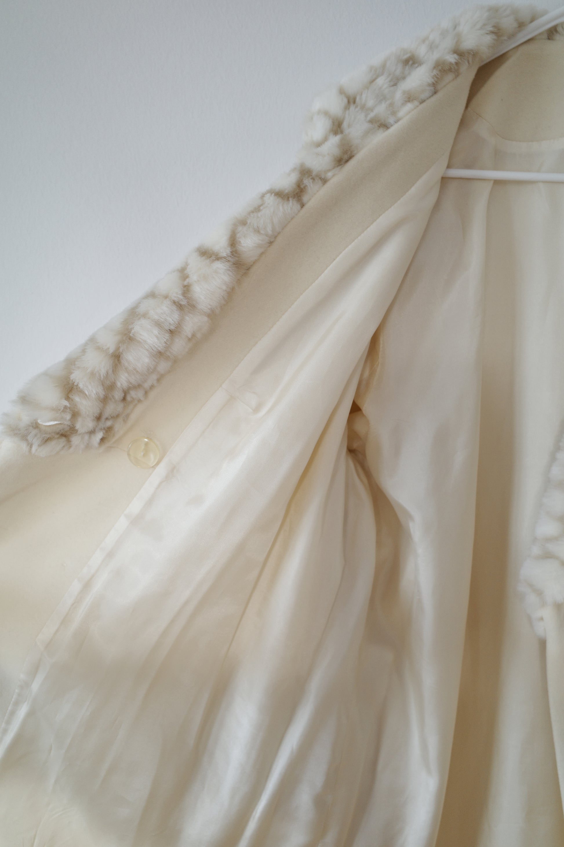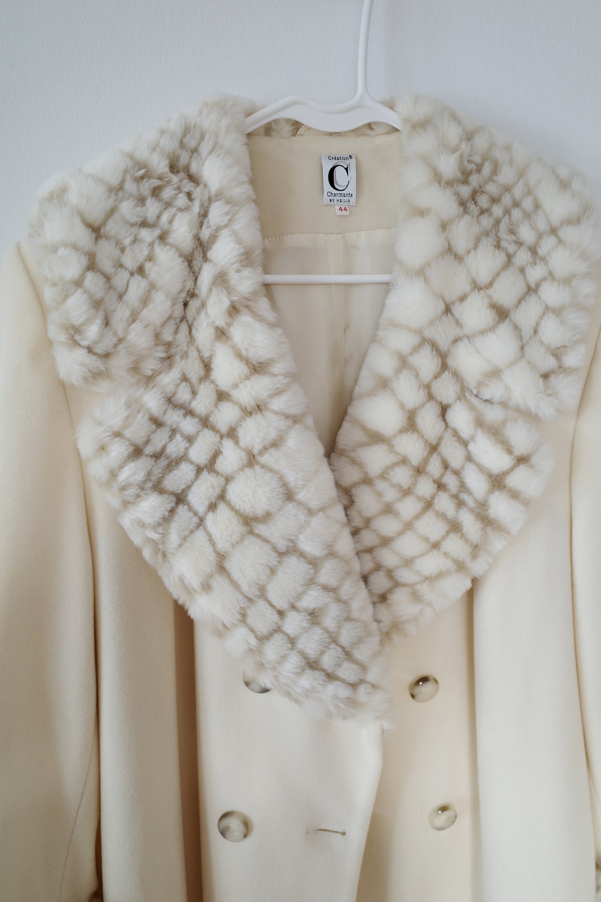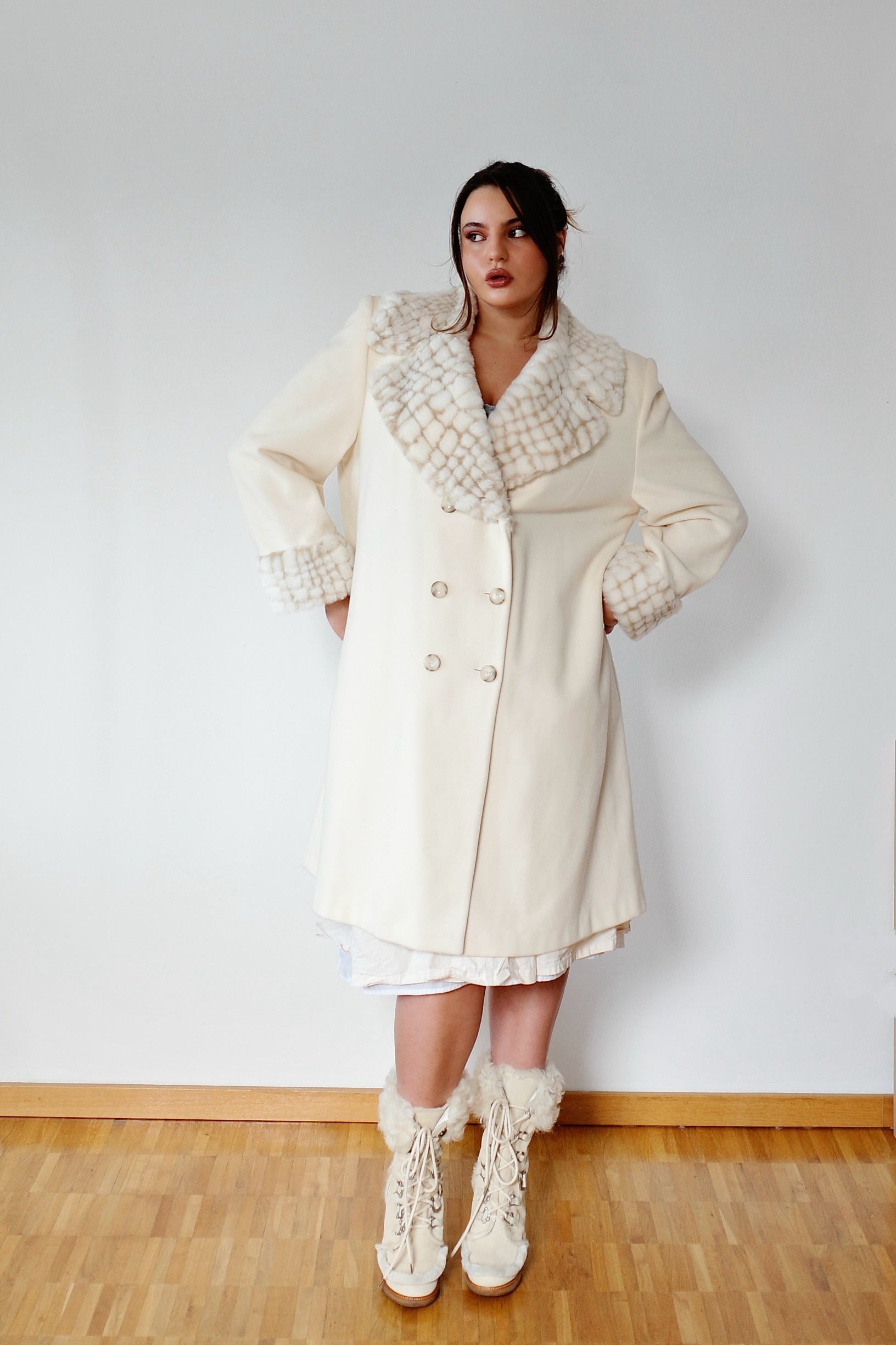 VINTAGE — Soft cream-toned faux fur coat with a dramatic oversized collar and matching cuff details. Features a double-breasted front and a gently flared silhouette that gives the piece a classic, slightly theatrical winter look. Made from a lighter-weight fabric, it works perfectly as a transitional coat.