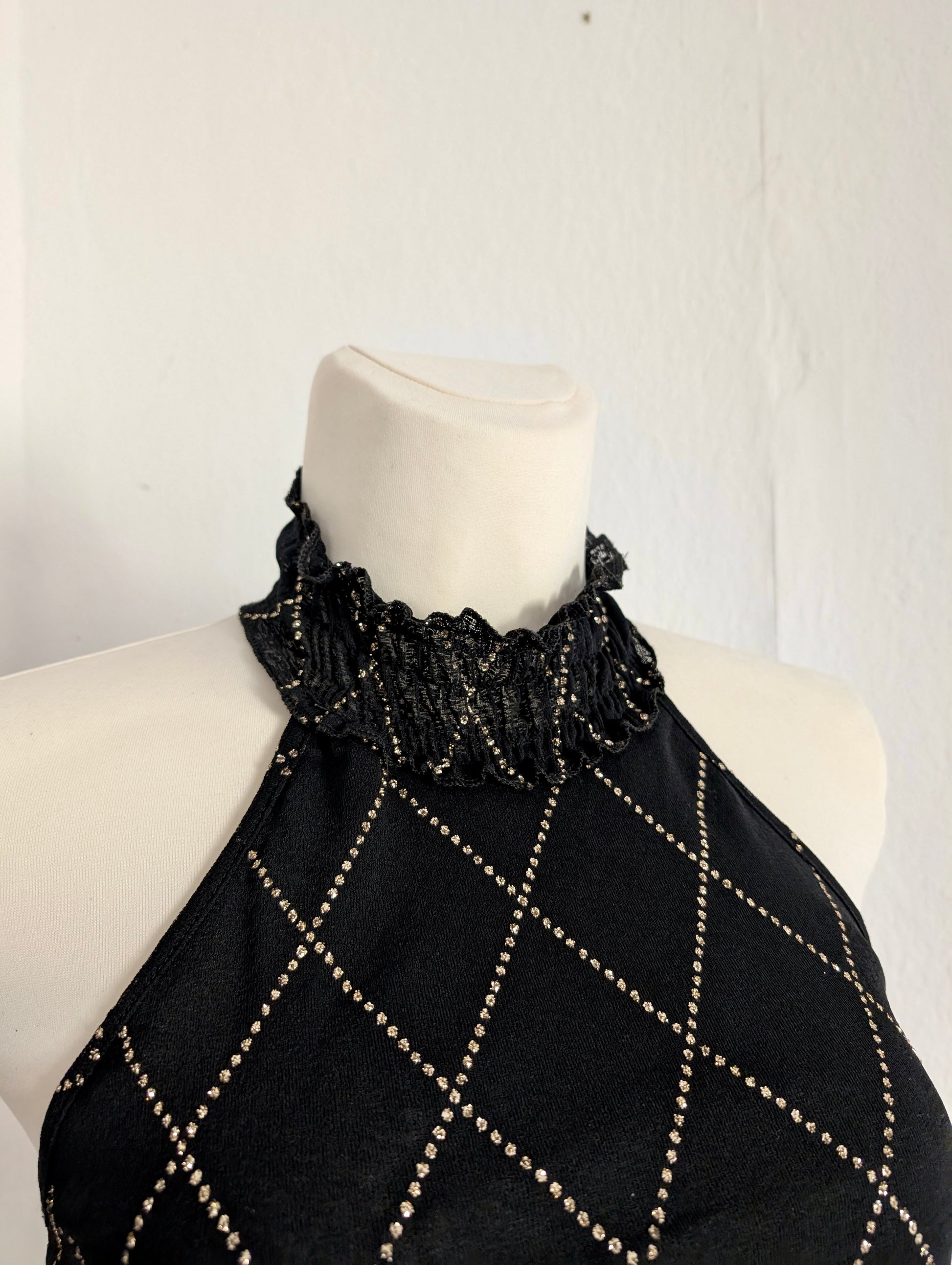 VINTAGE — This eye-catching halter top features an all-over glitter embellishment arranged in a subtle check pattern, creating a shimmering effect. Made from a stretchy, comfortable fabric, it hugs the body while allowing freedom of movement. The closed halter neckline and the scrunched hem gives it a playful, gathered look.