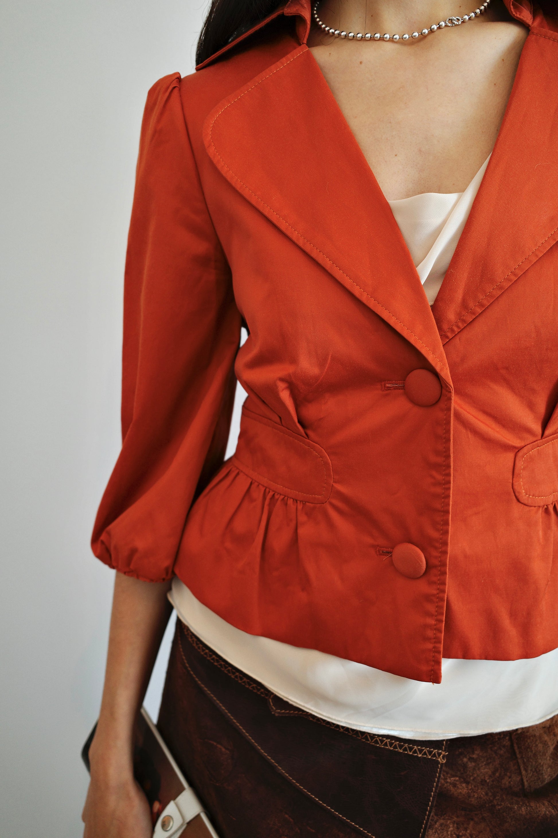 VINTAGE — vintage cropped jacket in vibrant orange with a tailored fit. With puffed 3/4 sleeves, peplum-style waist detailing, and button front closure. A bold yet feminine piece that adds structure and colour to any look.