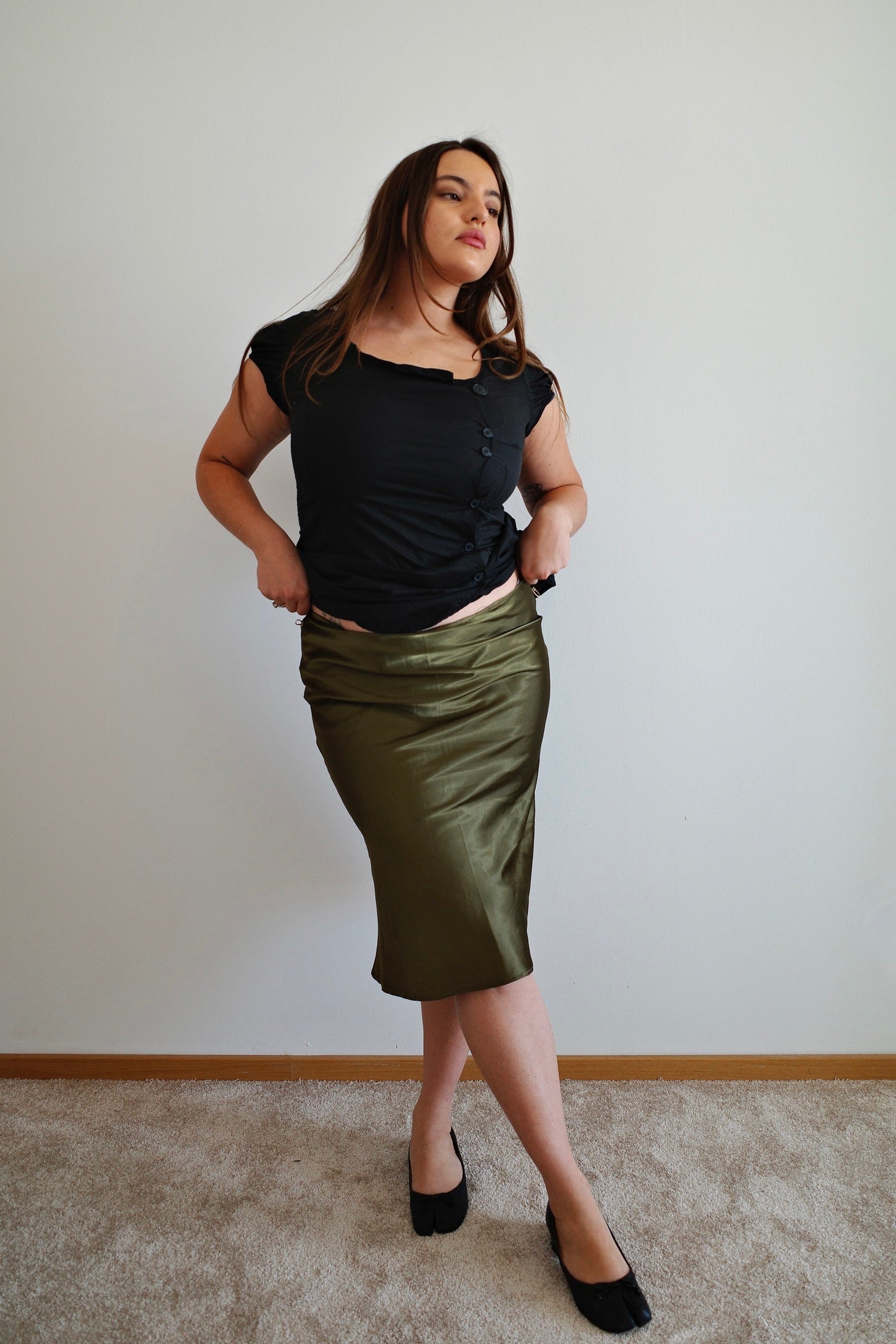 VINTAGE (Jeff Galano) — elegant olive green satin-finish skirt with a smooth, fluid drape and subtle sheen. Mid-length silhouette that flatters the figure and moves beautifully with the body. A timeless wardrobe staple with a touch of understated glamour.