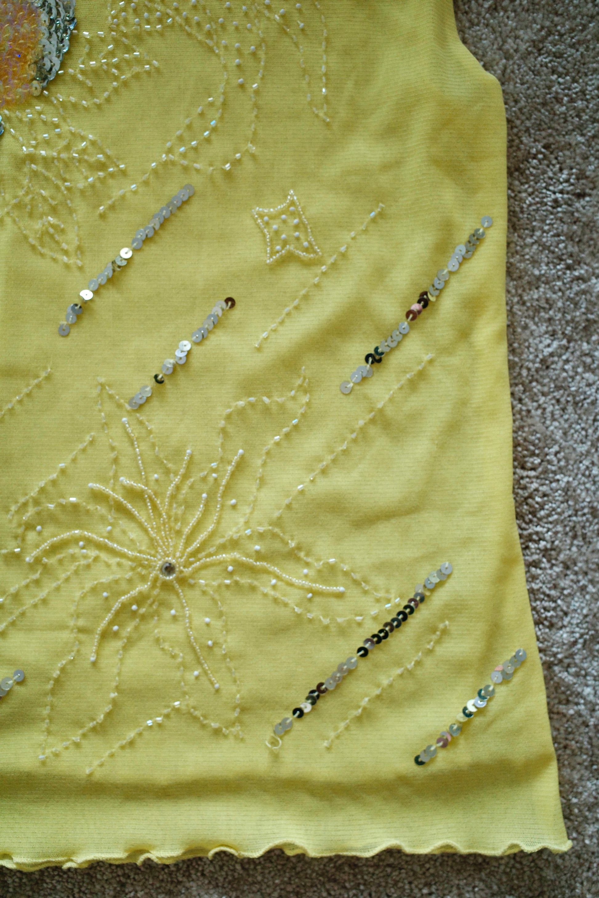VINTAGE — yellow double-layered mesh top with floral sequin embroidery and ruffled