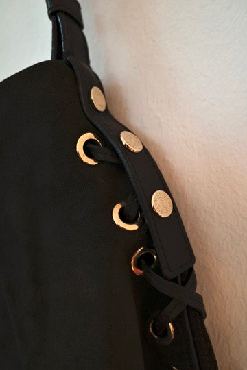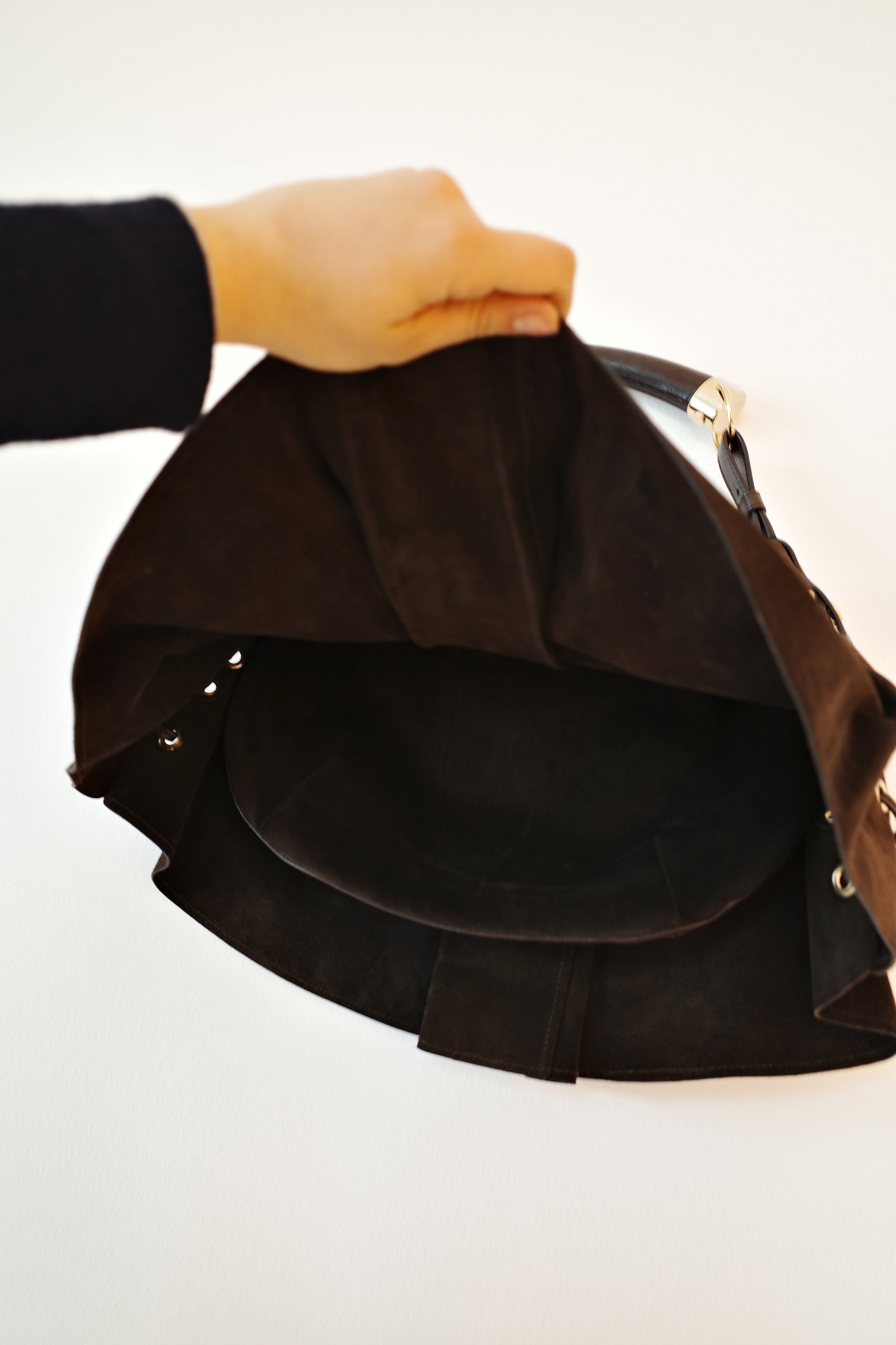 A rare collector’s piece from Yves Saint Laurent’s early 2000s era. Crafted from rich brown suede leather with gold-tone hardware, featuring “lace-up” detailing along the sides and the iconic curved Mombasa horn-style handle. This bag embodies YSL’s luxurious yet organic aesthetic from the Tom Ford era, blending bohemian sensuality with structured elegance.